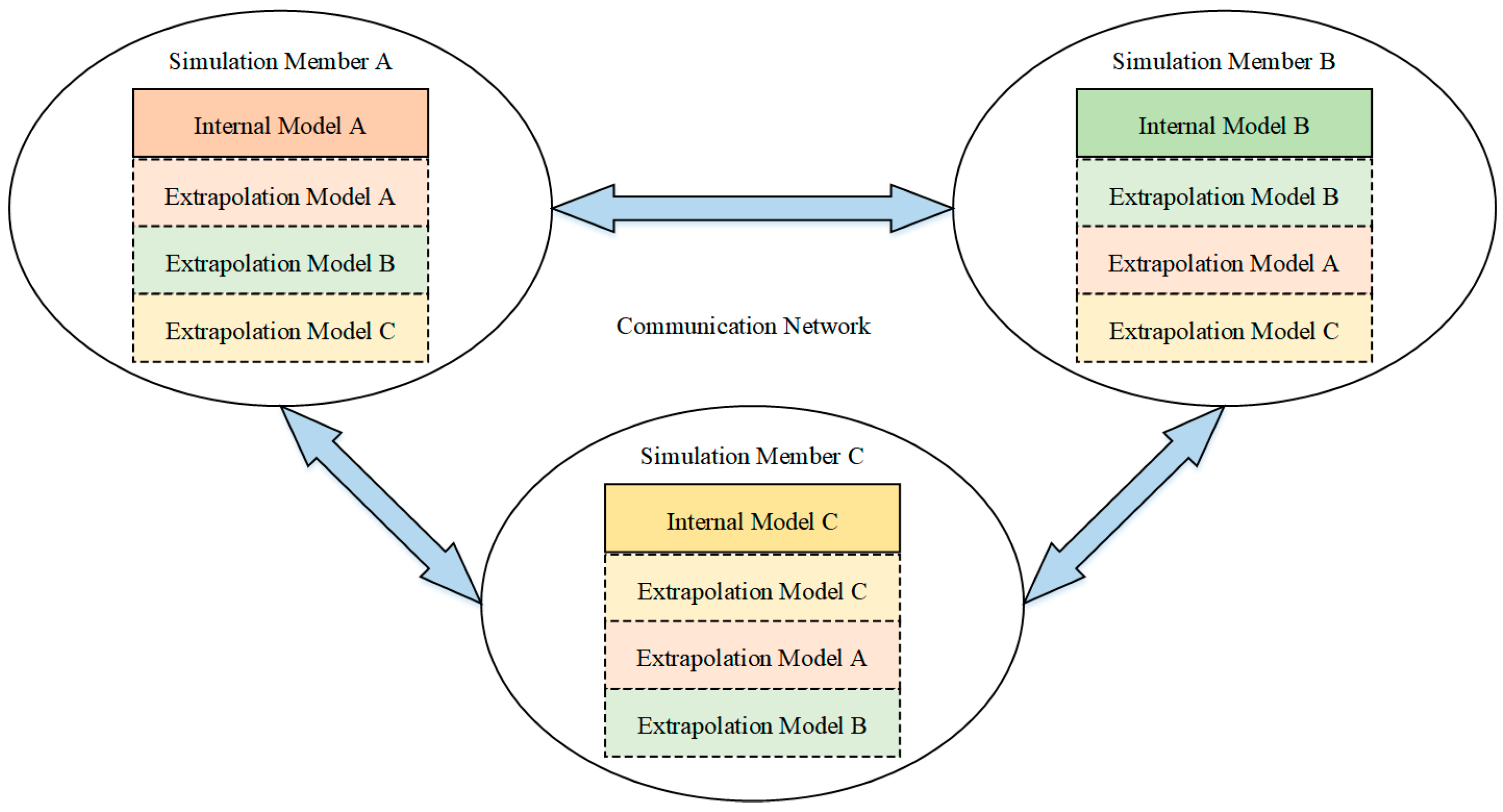 Figure 8 was constructed. Taking simulation member A as an example, A’s internal model reflects the true motion state of target A, and A’s extrapolation model reflects the estimated state of fighter A. During the maneuver, if the state information deviation between A’s internal and A’s extrapolation is not significant, then A’s extrapolation information does not need to be updated to the true value. Only when the deviation exceeds a certain threshold will A’s extrapolation initiate an update and send the relevant information synchronously to members B and C.