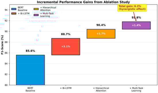Despite this noise, our multi-task learning framework demonstrates robustness. As shown in Table 9, incorporating auxiliary symptom recognition and severity assessment tasks improves the main depression classification F1-score from 89.6% (single-task) to 91.8% (full MTL), representing a +2.2 percentage point improvement. This improvement stems from two mechanisms: (1) regularization effect—the auxiliary tasks provide additional supervision that prevents overfitting to potentially noisy binary labels; and (2) hierarchical attention’s implicit filtering—the character-level and post-level attention mechanisms tend to downweight contradictory or ambiguous posts. Table 10, symptom detection performance by linguistic explicitness, further shows that symptom recognition alone achieves 90.9% F1, while severity assessment alone reaches 91.2% F1, indicating that both auxiliary tasks contribute independently before combining synergistically in the full MTL framework. Thus, while 18% noise does impact implicit symptom detection more severely, our MTL architecture partially mitigates this through its regularization properties and attention-based signal prioritization.