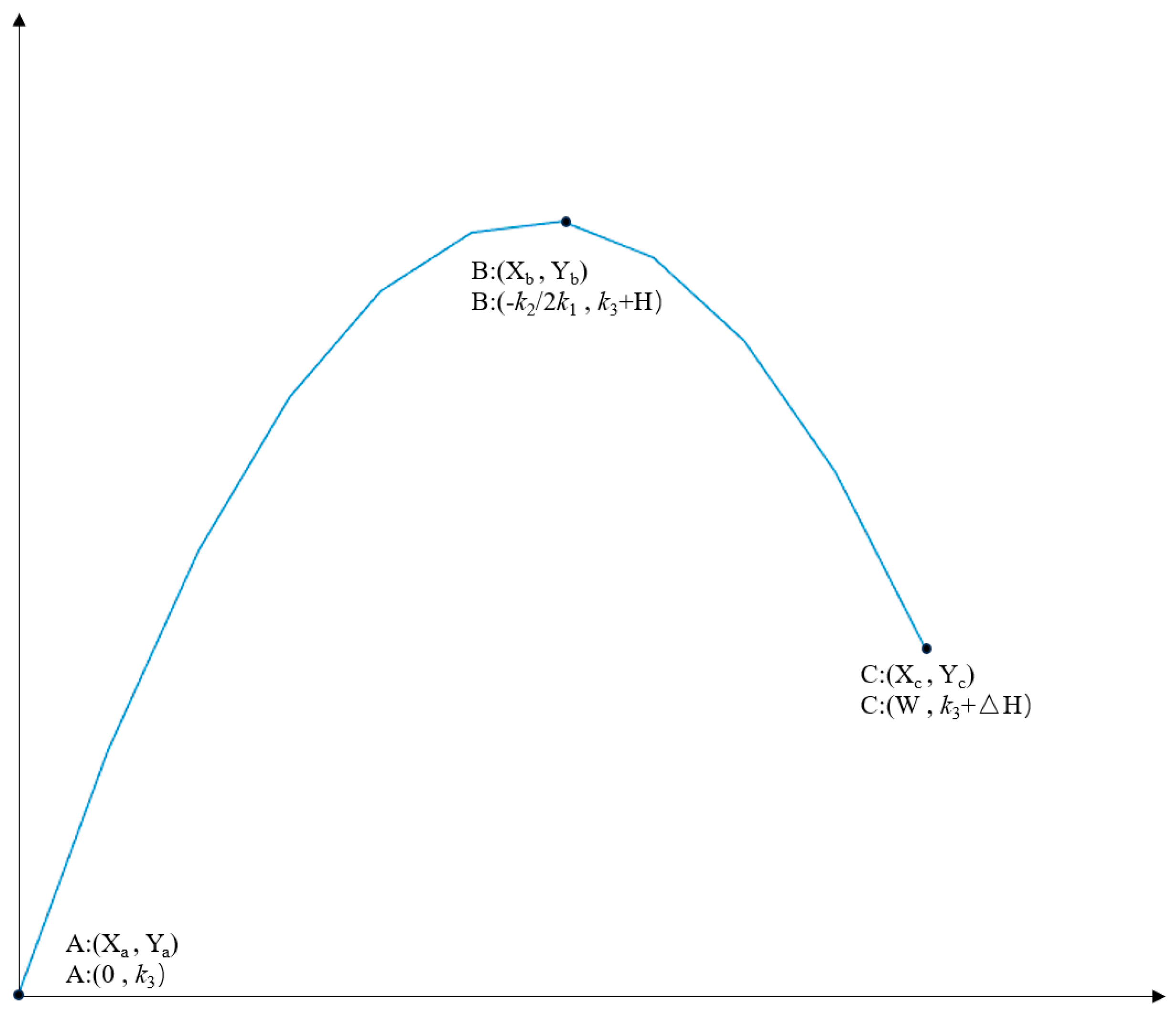 Taking the case where the defect’s minimum grayscale point is located at the starting point as an example, substituting into Equation (1) yields the following coordinate expressions: the starting point at (0, k3), the grayscale maximum point at (Xb, k3 + H), and the endpoint at (W, k3 + ΔH). The three specific boundary conditions are: