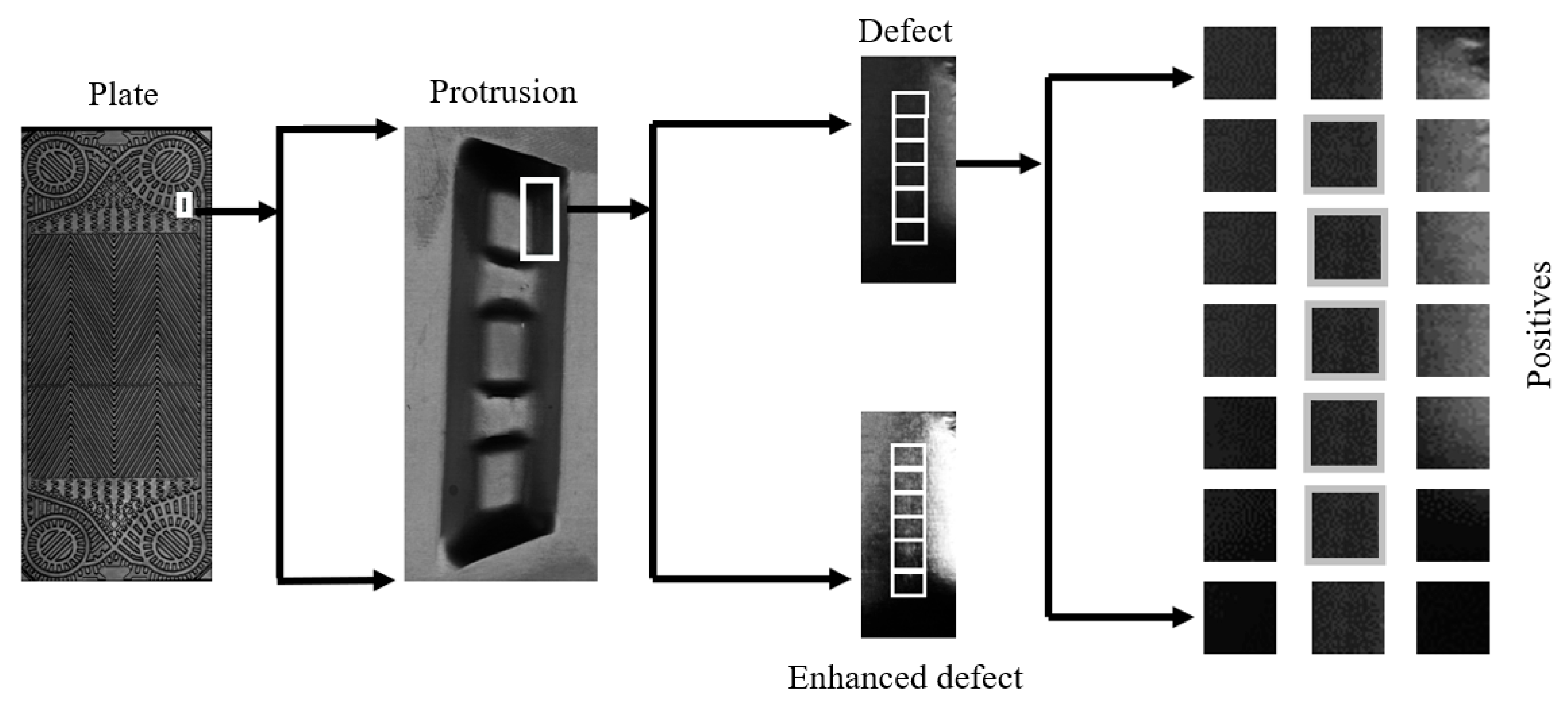 Figure 8 sequentially presents the plate heat exchanger’s full structure, raised structural zones prone to defects, localized defect regions, and cropped positive sample images derived from bounding boxes.
