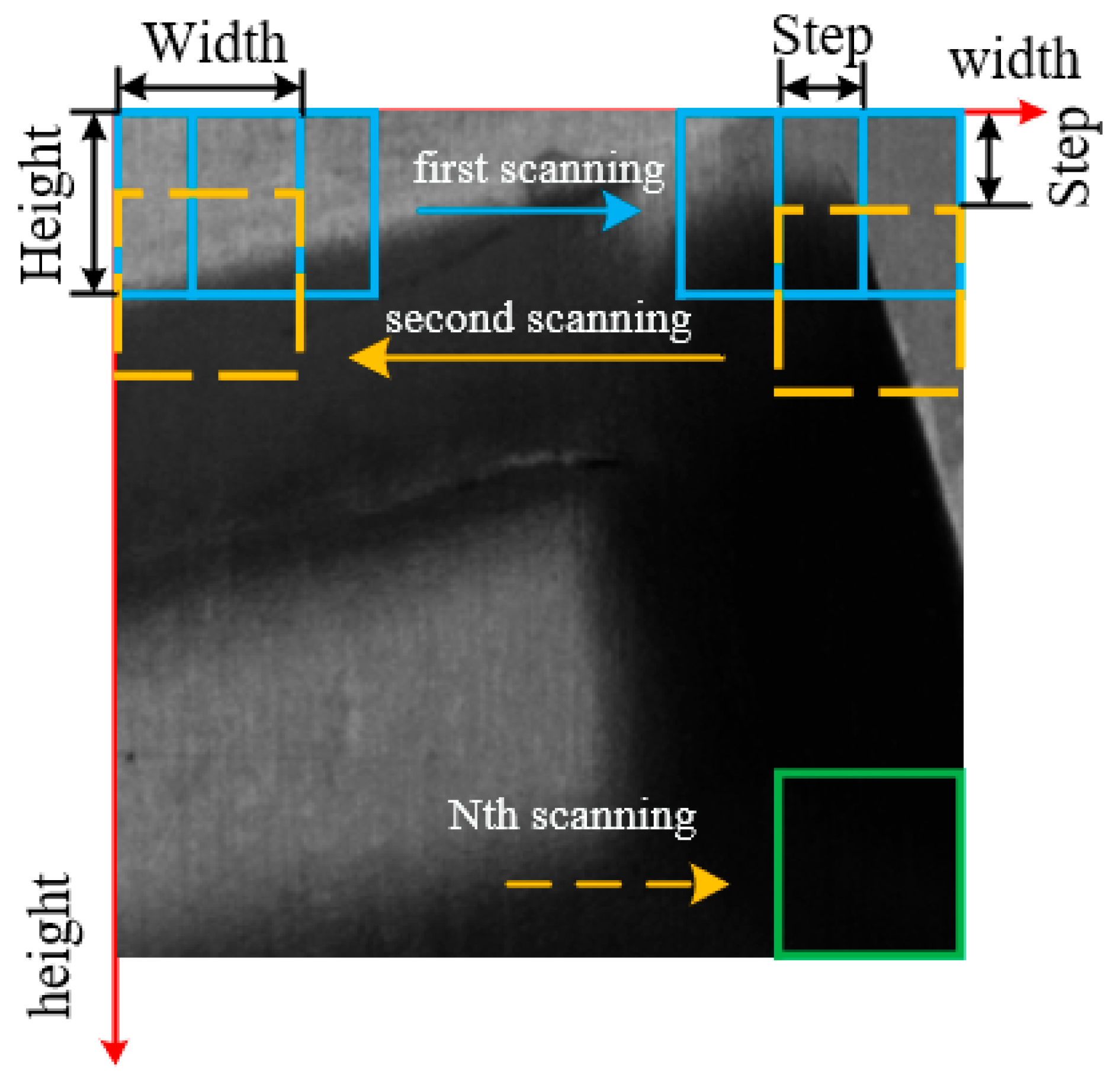 Figure 10, fixed-pixel strides slide along width and height axes. The window size accommodates the largest object defect entirely, while stride settings ensure the smallest defect is fully covered by at least one window—eliminating omission risks from excessive strides. This parametric configuration balances computational efficiency with detection coverage.