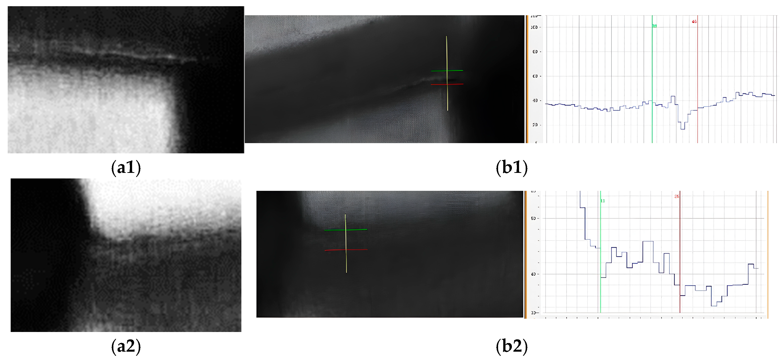 Figure 13(b1,b2) show the defect longitudinal grayscale distribution curve.