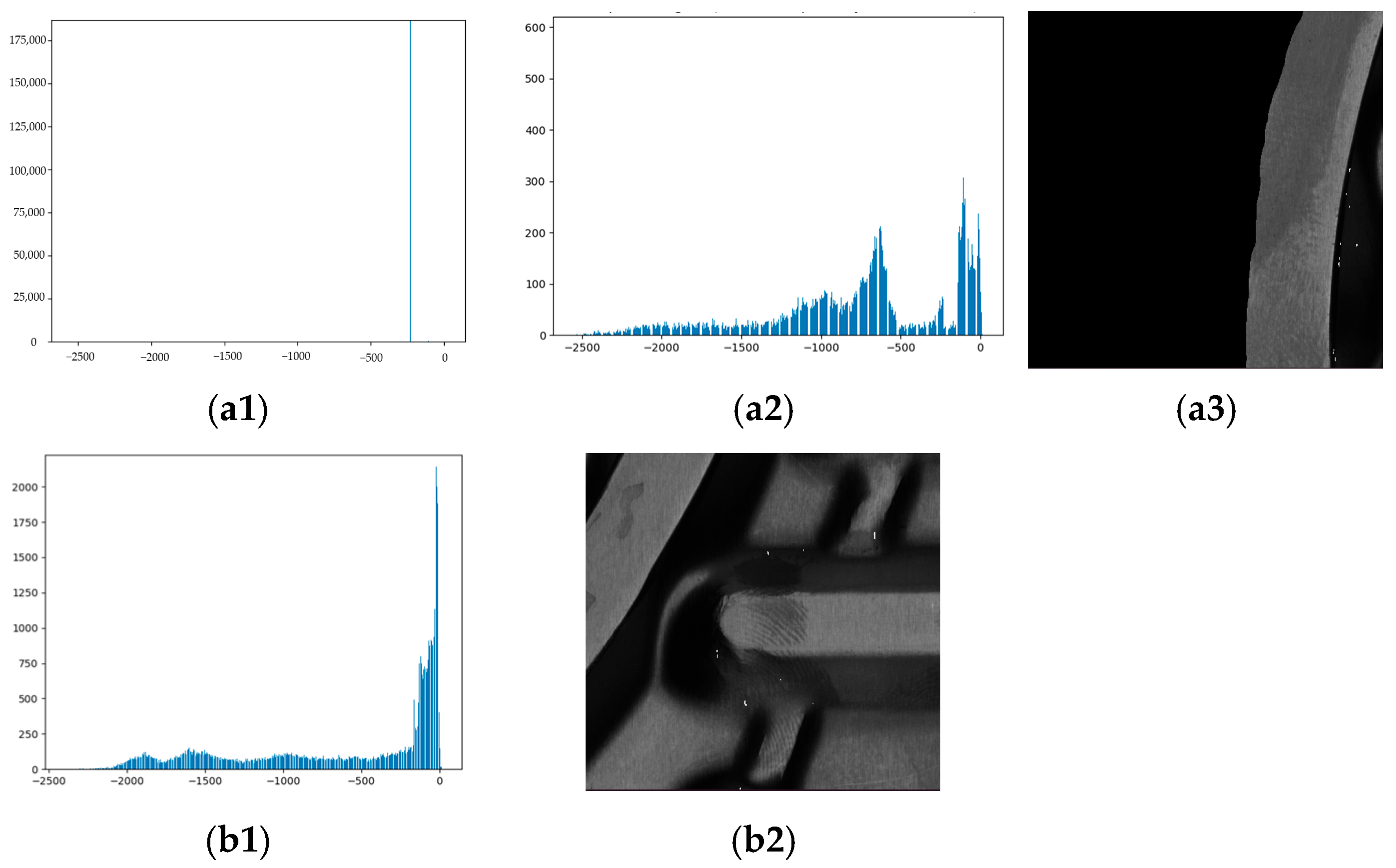 Figure 15(a1) illustrates the feature distribution of a plate edge image. Due to the presence of extensive structurally repetitive background regions in the plate edge image, their consistent convolutional responses result in feature values being highly concentrated in a sharp, prominent peak. To reveal the distribution of the remaining feature values,