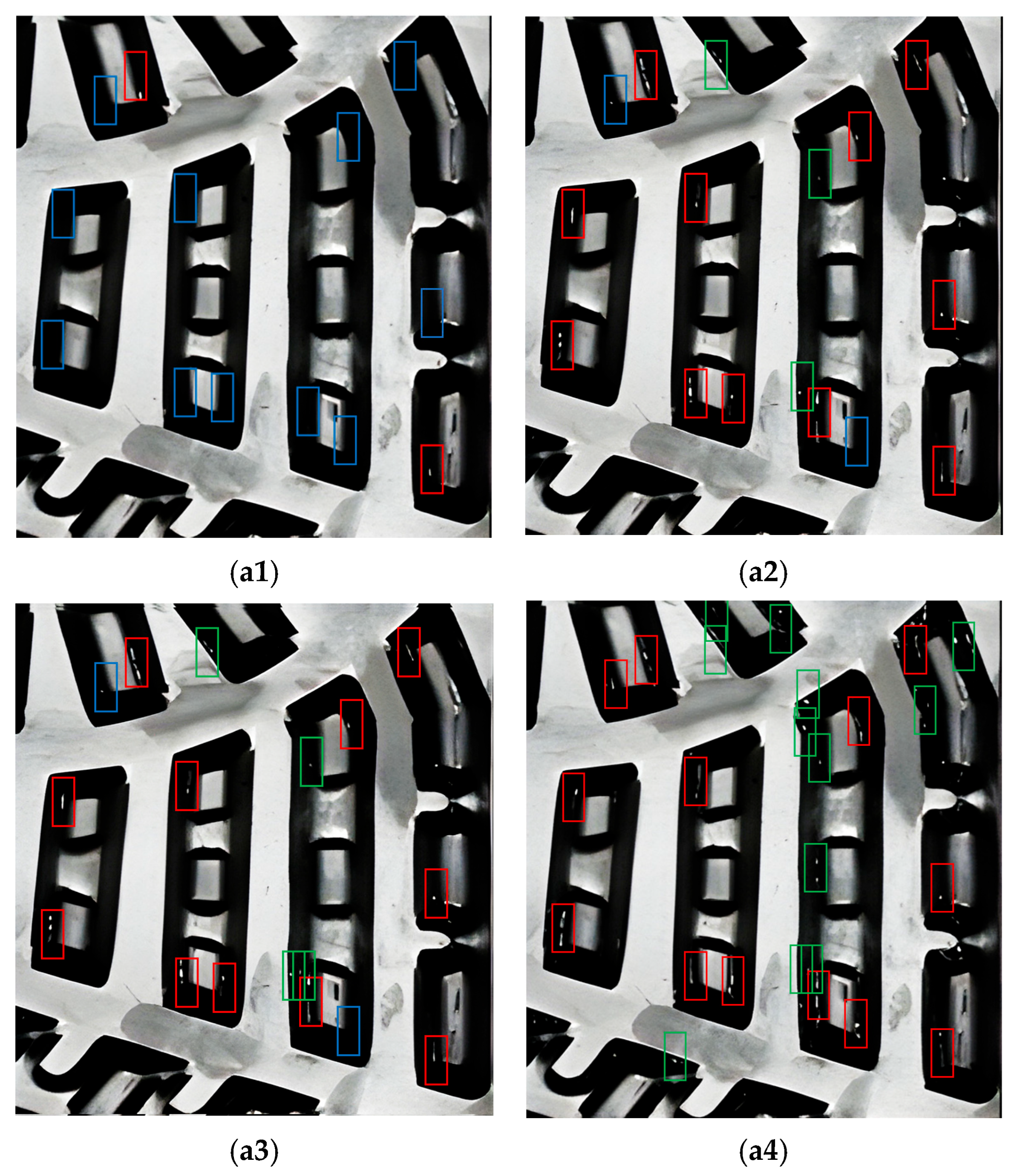 Figure 16(a1–a4), respectively, illustrate the feature point distributions for the top 0.1%, 0.1–0.3%, 0.3–0.5%, and 0.5–1% intervals, respectively. To clearly visualize the final detection results, detected defects are marked with red bounding boxes, missed defects with blue boxes, and false positives with green boxes. As observed, for a total of 13 defects, the 0.1% threshold resulted in TP = 2, FP = 0, FN = 11. The 0.3% threshold resulted in TP = 11, FP = 3, and FN = 2. The 0.5% threshold resulted in TP = 11, FP = 4, and FN = 2. The 1% threshold resulted in TP = 13, FP = 0, and FN = 12.