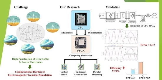 In this paper, we focus on a general-purpose FPGA-based accelerated solver algorithm for offline EMT simulation from three aspects: unifying models, reducing computational time overhead, and improving resource utilization. Building on this, a heterogeneous offline simulation platform based on CPU and FPGA is constructed. This platform utilizes the CPU’s suitability for complex logic and branch computation to complete simulation initialization and accelerate the computation of complex control systems. It leverages the FPGA’s advantages of high parallelism and deep pipelining to compute power electronic converter models that are computationally intensive, require small step sizes, and are time-consuming. Data interaction between the CPU and FPGA is achieved via PCIe. Through the proposed offline simulation accelerated solver and simulation process, heterogeneous parallel offline EMT simulation for general complex models can be realized. Finally, a test case of a grid-connected PV power generation system is built on this heterogeneous offline simulation platform. By comparing the results with those from a single-architecture CPU simulation, the accuracy and efficiency of the heterogeneous offline simulation platform are verified.