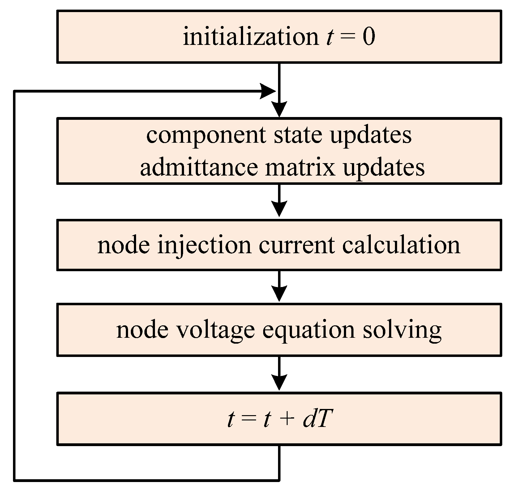 Figure 1, can be divided into the following steps: initialization, component state updating and admittance matrix updating, node injection current calculation, and node voltage equation solving.