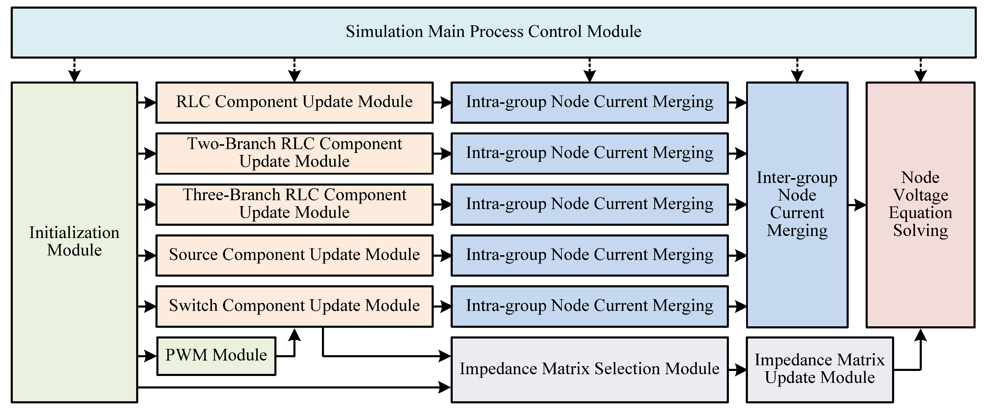 Commonly used EMT simulation components may include passive elements, sources, various types of switches, transformers, and transmission lines. From the perspective of model unification, this paper categorizes different component types into five component update modules based on their historical current calculation formulas. After the components update their historical currents, node current merging is first performed within each group, followed by inter-group node current merging. Simultaneously, the system impedance matrix is updated according to the switch states. Finally, the node voltage equations are solved.