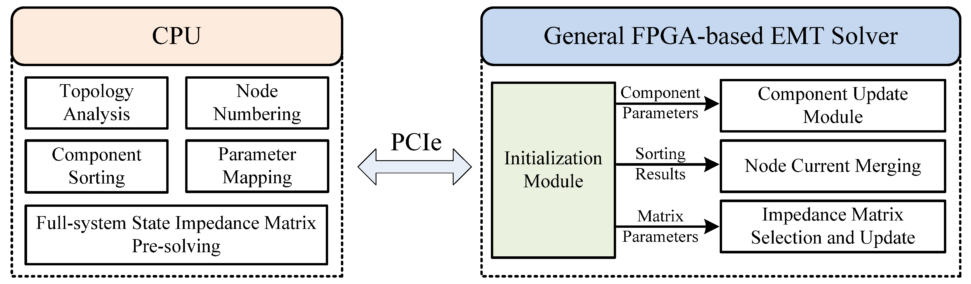 In this paper, the FPGA-based general EMT offline simulation solver framework serves the CPU-FPGA heterogeneous platform. To leverage computational resources efficiently, complex initialization processes—such as topology analysis, node numbering, component sorting, parameter mapping, and pre-solving the full-state system impedance matrix—are handled by the CPU. Before the simulation computation begins, the initialization results are transmitted to the initialization module of the general solver via PCIe. The FPGA can then read the parameters required for EMT simulation from the initialization module, including the number of nodes, topology information, simulation step size, component parameters, and full-state system impedance matrix parameters (