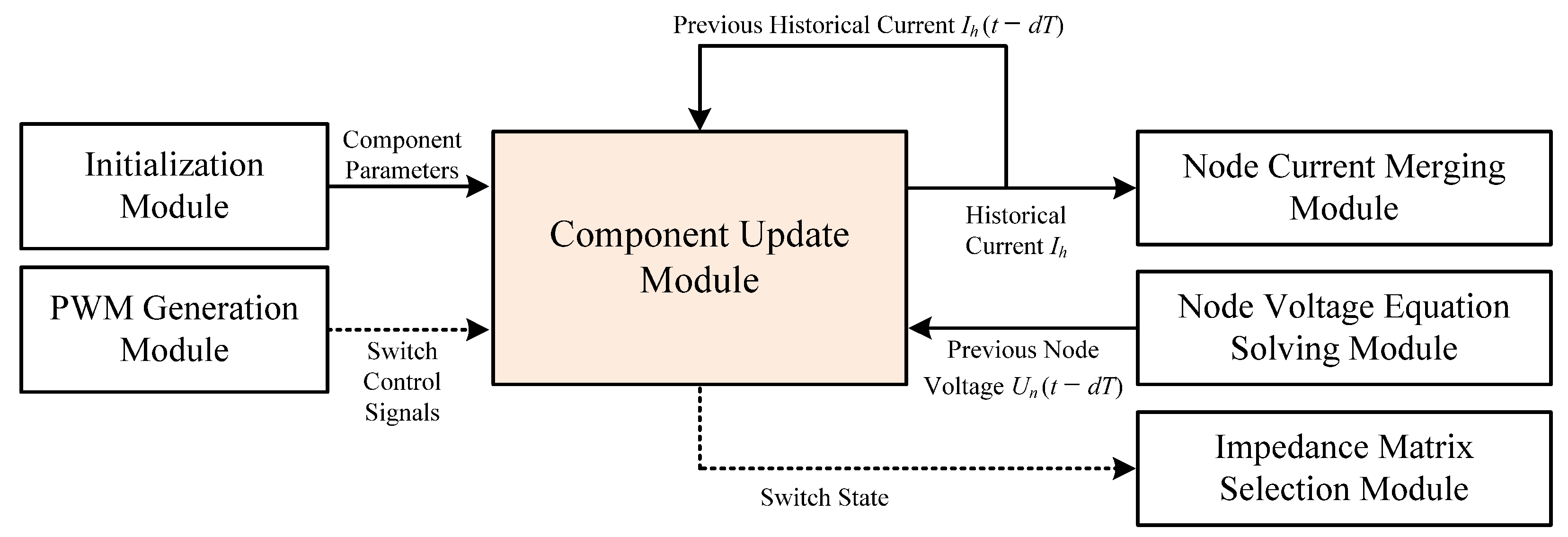 To meet the high-frequency switching requirements of switch-type components, a built-in pulse width modulation (PWM) module is used to modulate the reference wave into a high-frequency PWM signal, thereby controlling the switching elements. Furthermore, after the state of a switch-type element is updated, its status is output to the impedance matrix selection module for updating the system impedance matrix. The framework of the component update module is shown in