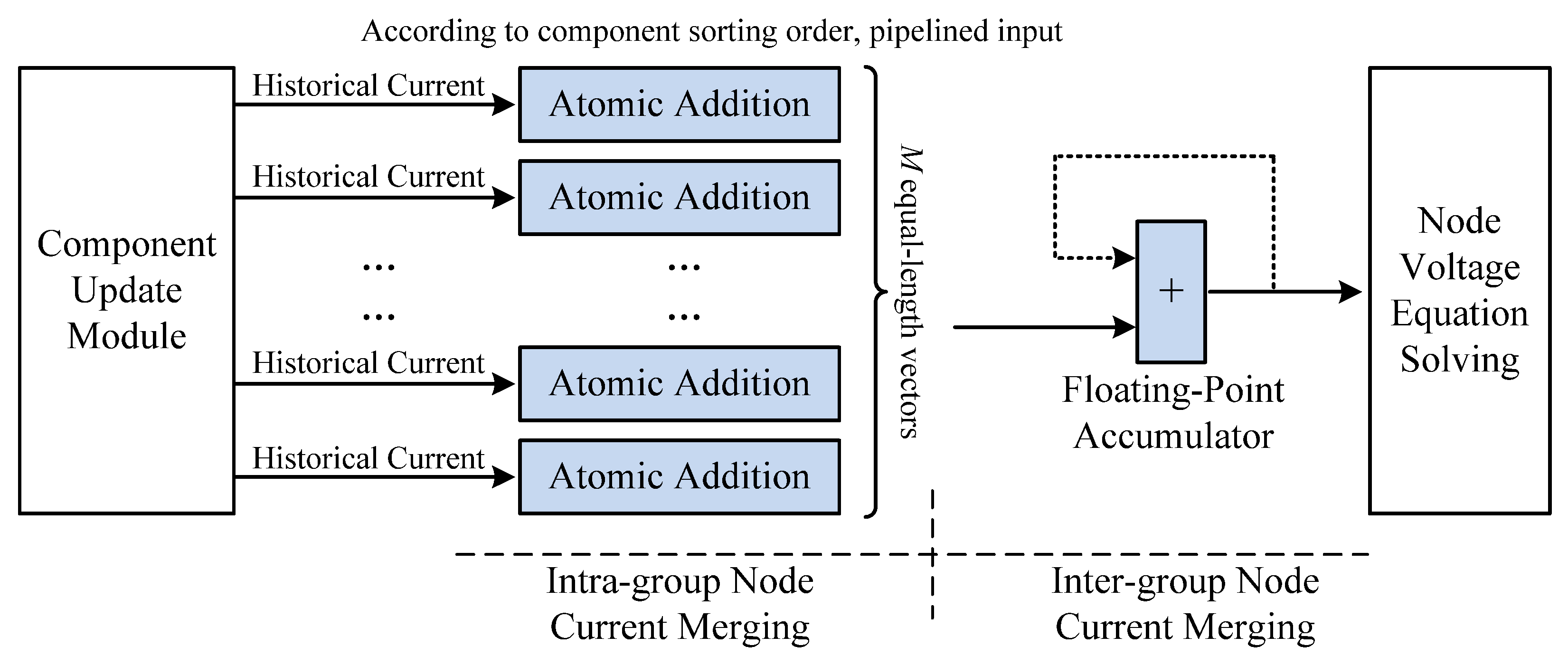 Based on the grouping of the component update modules, once the intra-group node current merging is complete for all modules, M groups of equal-length vectors are obtained. Inter-group node current merging is then performed, which essentially involves floating-point vector accumulation, implemented using floating-point accumulators.