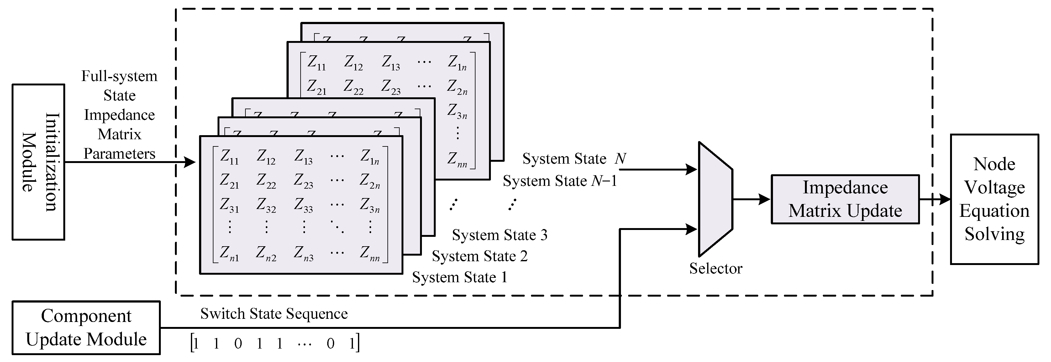 The switch states output by the component update modules form a switch state sequence, composed of 0 s and 1 s (0 for OFF, 1 for ON). Each switch state sequence corresponds to a system state. Based on the switch state sequence at the current time step, the corresponding system impedance matrix is identified. A selector is used to update the impedance matrix, which is then output to the node voltage equation solving module for the subsequent calculation. The implementation block diagram is shown in