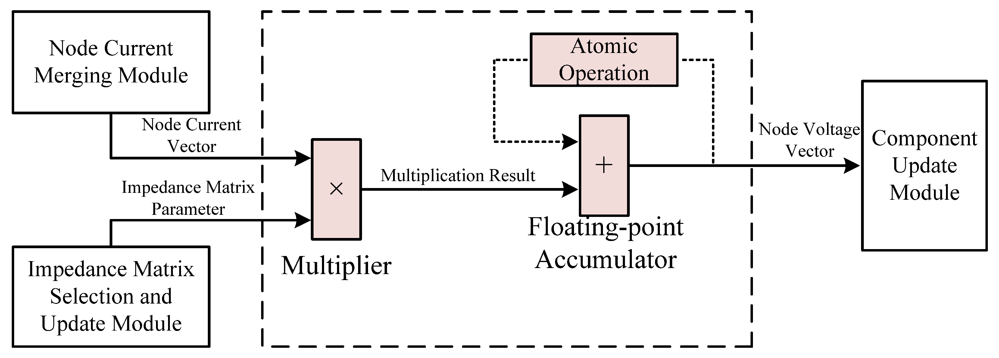 Node voltage equation solving module. This module employs parallel floating-point multipliers to calculate the product of the impedance matrix elements and the node current vector, followed by a pipelined floating-point accumulator (reusing the atomic addition logic) to sum the partial results for each node voltage.