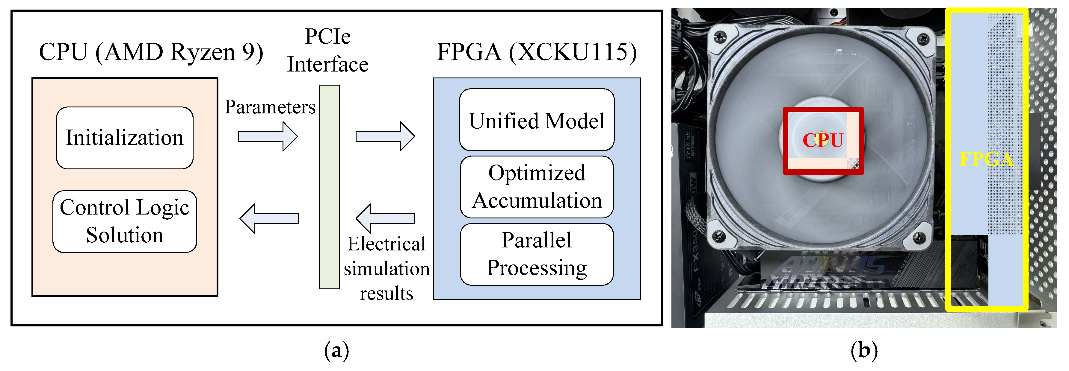 Hardware composition of heterogeneous offline simulation platform. (a) Hardware architecture of CPU-FPGA heterogeneous offline simulation, (b) Physical image of CPU-FPGA heterogeneous offline simulation platform.