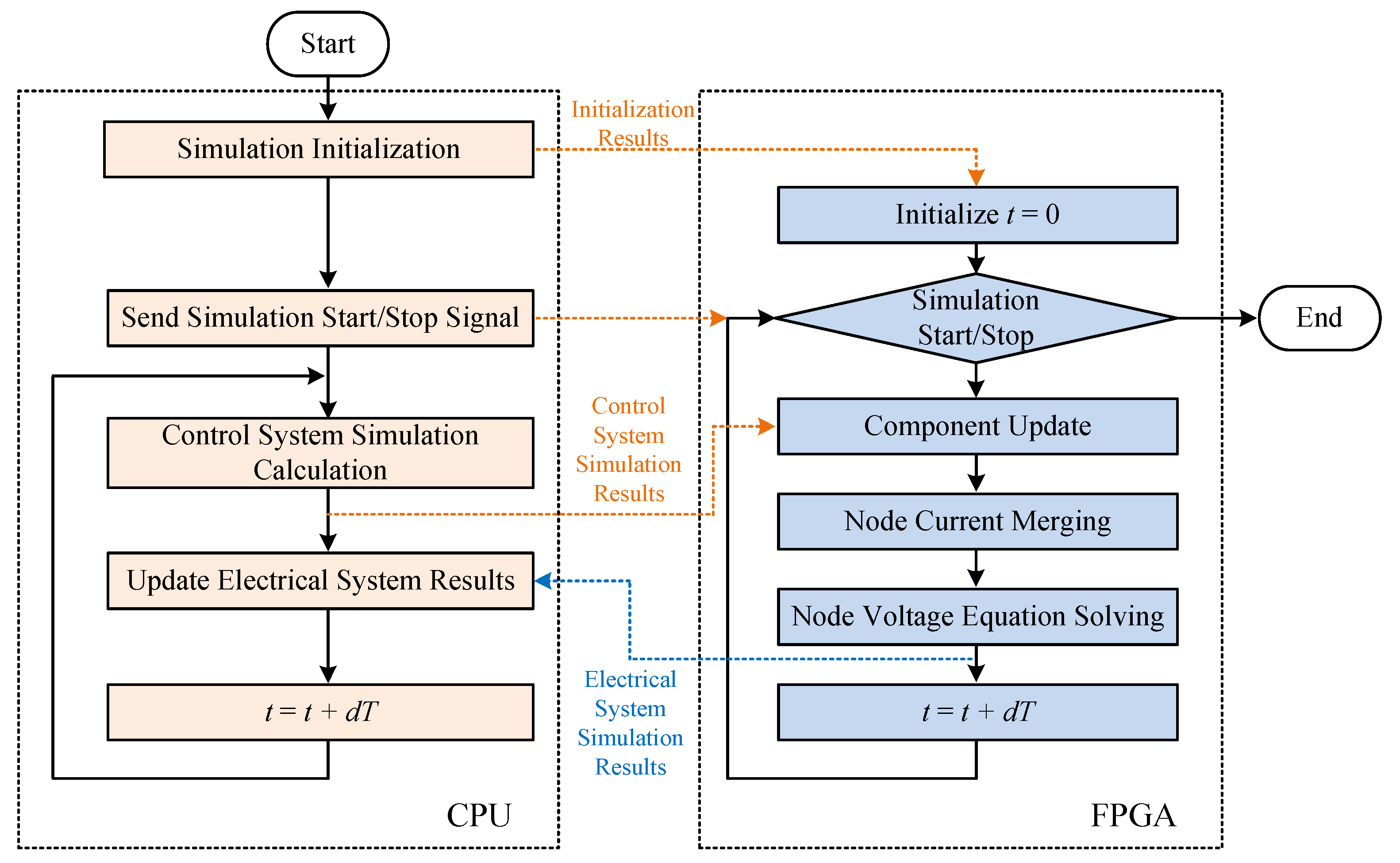 Figure 11. After the task starts, the CPU performs simulation initialization, analyzing basic simulation parameters and the simulation topology. Through node numbering and component sorting, it obtains a solution that offers favorable time overhead and resource utilization for FPGA computation, pre-solves the full-state system impedance matrices, and generates the initialization results. These initialization results and the simulation start signal are then transmitted to the FPGA via PCIe.