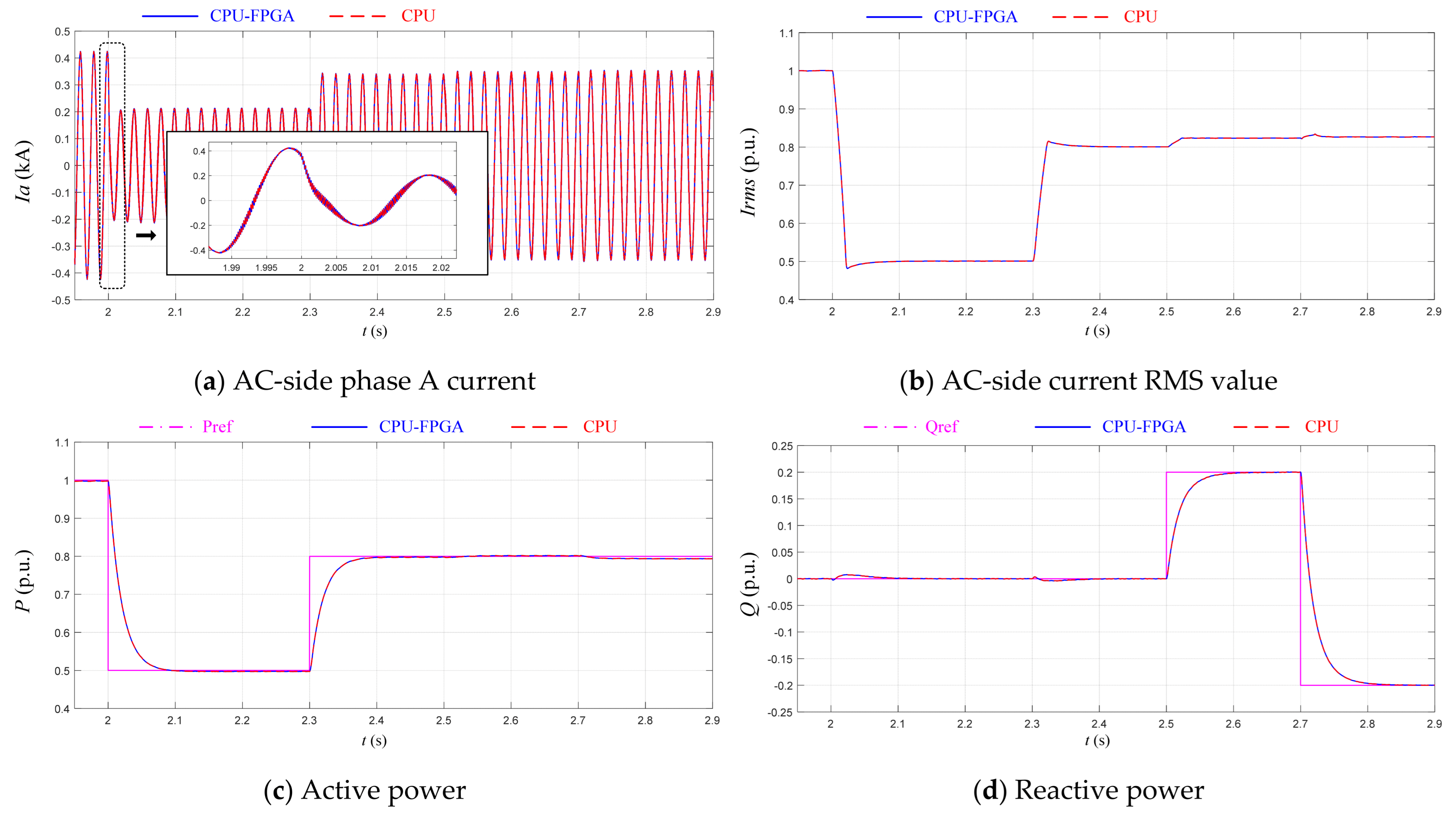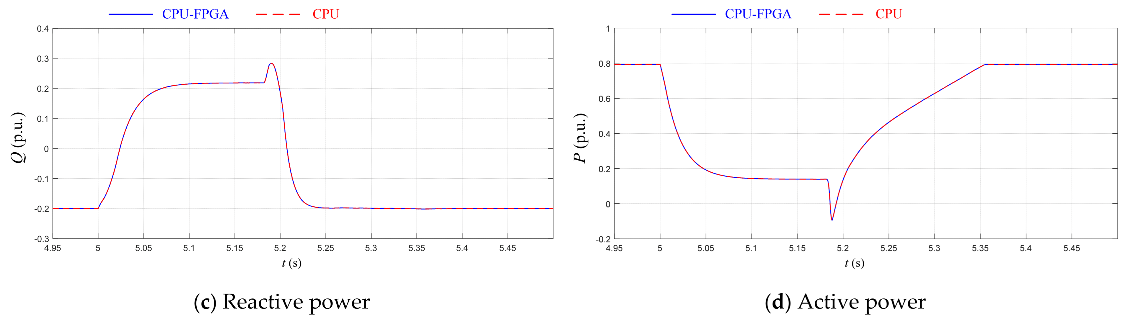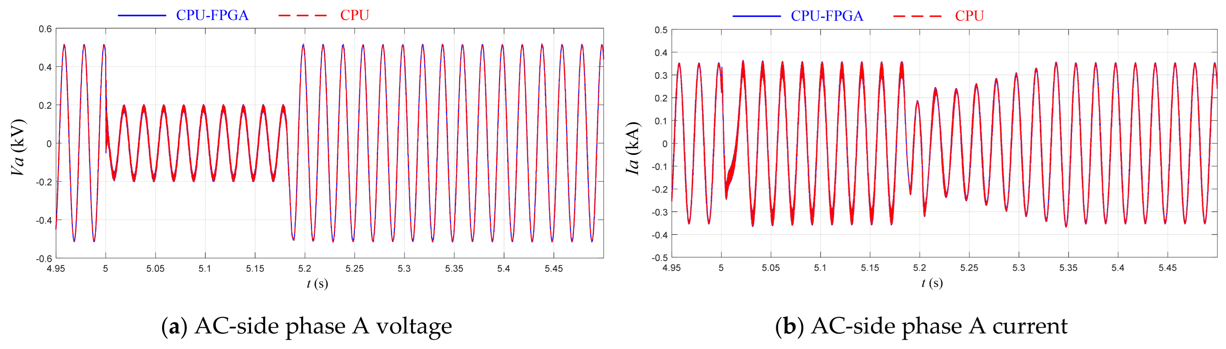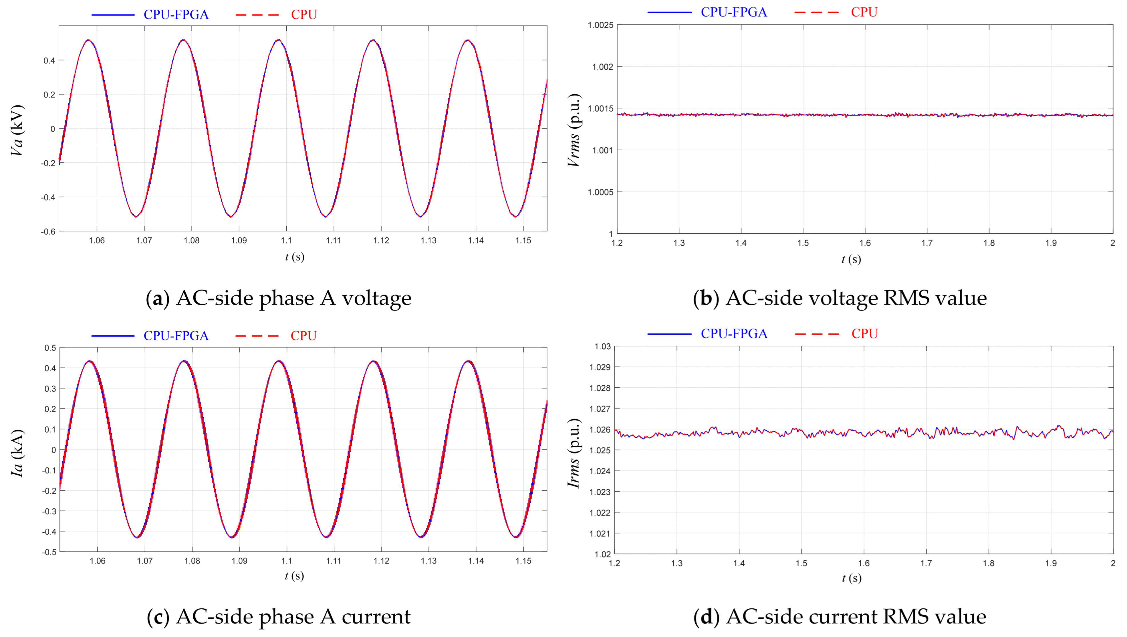 Figure 10. The CPU is responsible for simulation initialization, control system computation, and simulation waveform display, leveraging its strengths in high-level control and scheduling management. The FPGA is responsible for accelerating the EMT simulation of the electrical system, highlighting its capability for parallel high-speed computation. Data interaction between them is achieved via PCIe.