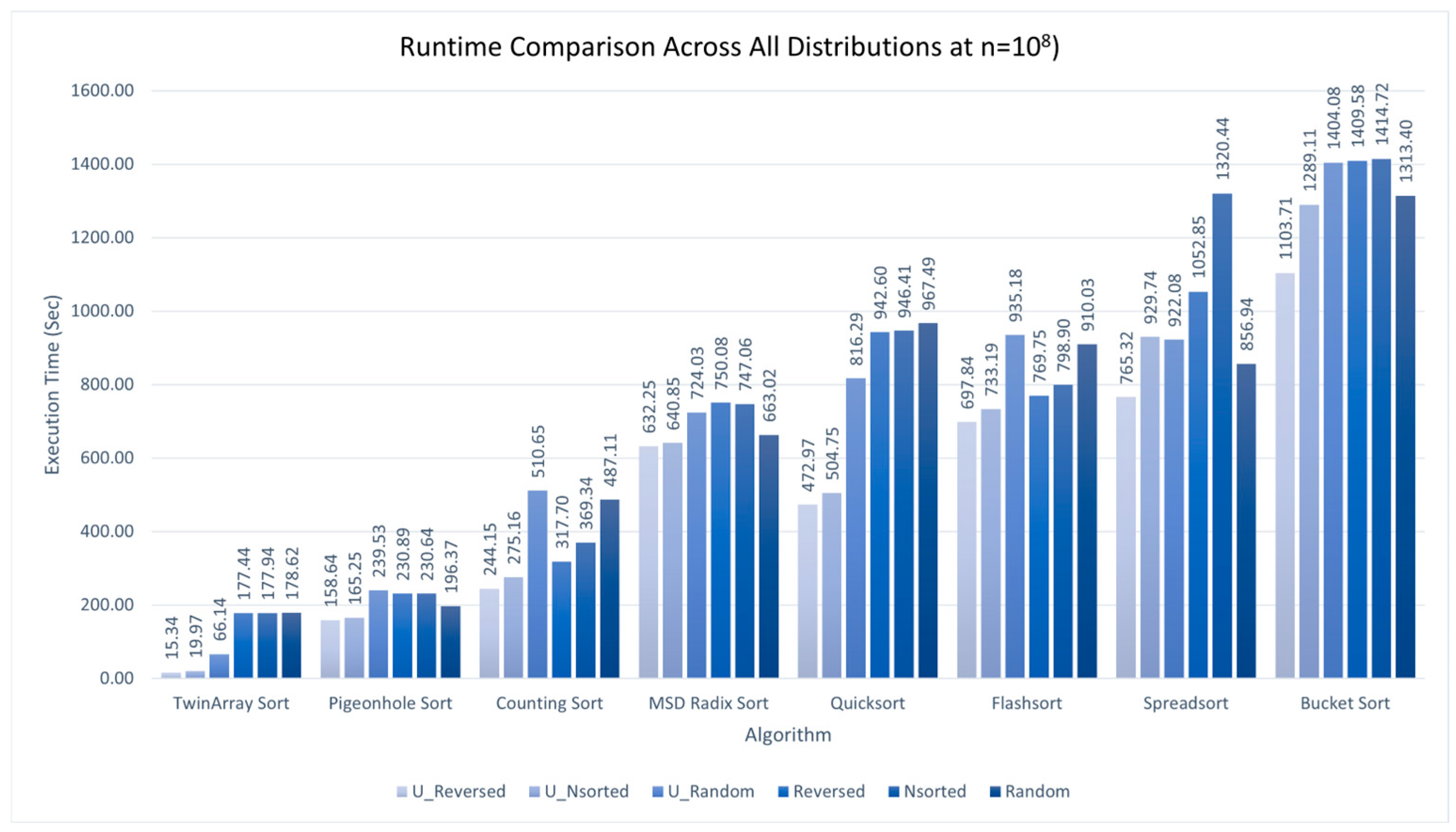 8. The six bars per algorithm correspond to U_Reversed, U_Nsorted, U_Random, Reversed, Nsorted, and Random distributions. As indicated by the lowest bar in each group, TwinArray Sort consistently outperforms the other algorithms across all distributions, with the largest margin appearing in the unique-element cases (U_Random, U_Reversed, U_Nsorted). These results align closely with the data presented in