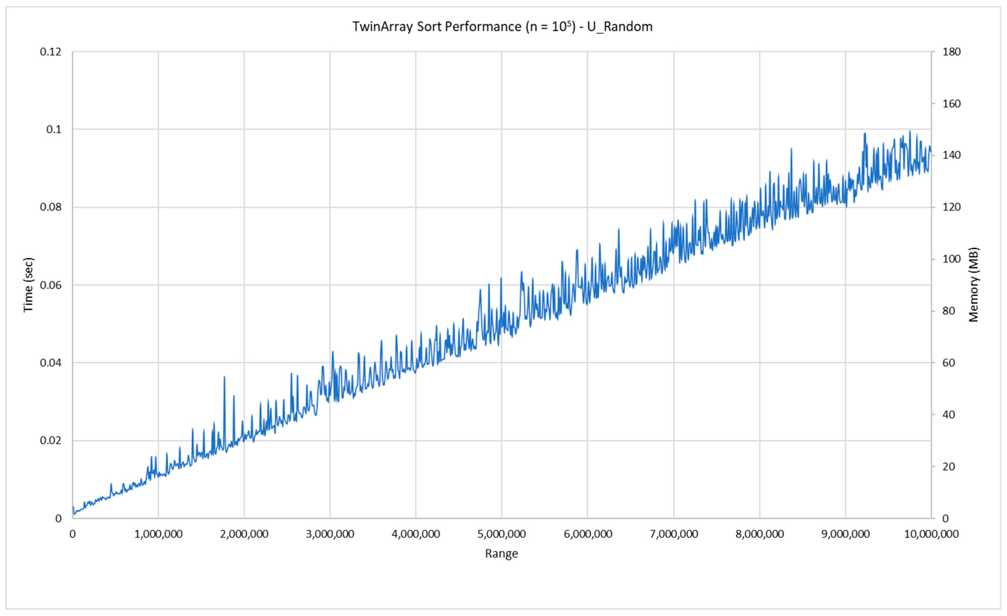 18]. These variables add to the overall extremely linear and predictable trend, but they also cause the jitteriness in the time measurements that is shown. Thus, TwinArray Sort is less efficient in situations when the number of items is small relative to the wide range of input values because of this deterioration. It works well in situations when the range of values is proportionate to the number of elements and relatively modest.