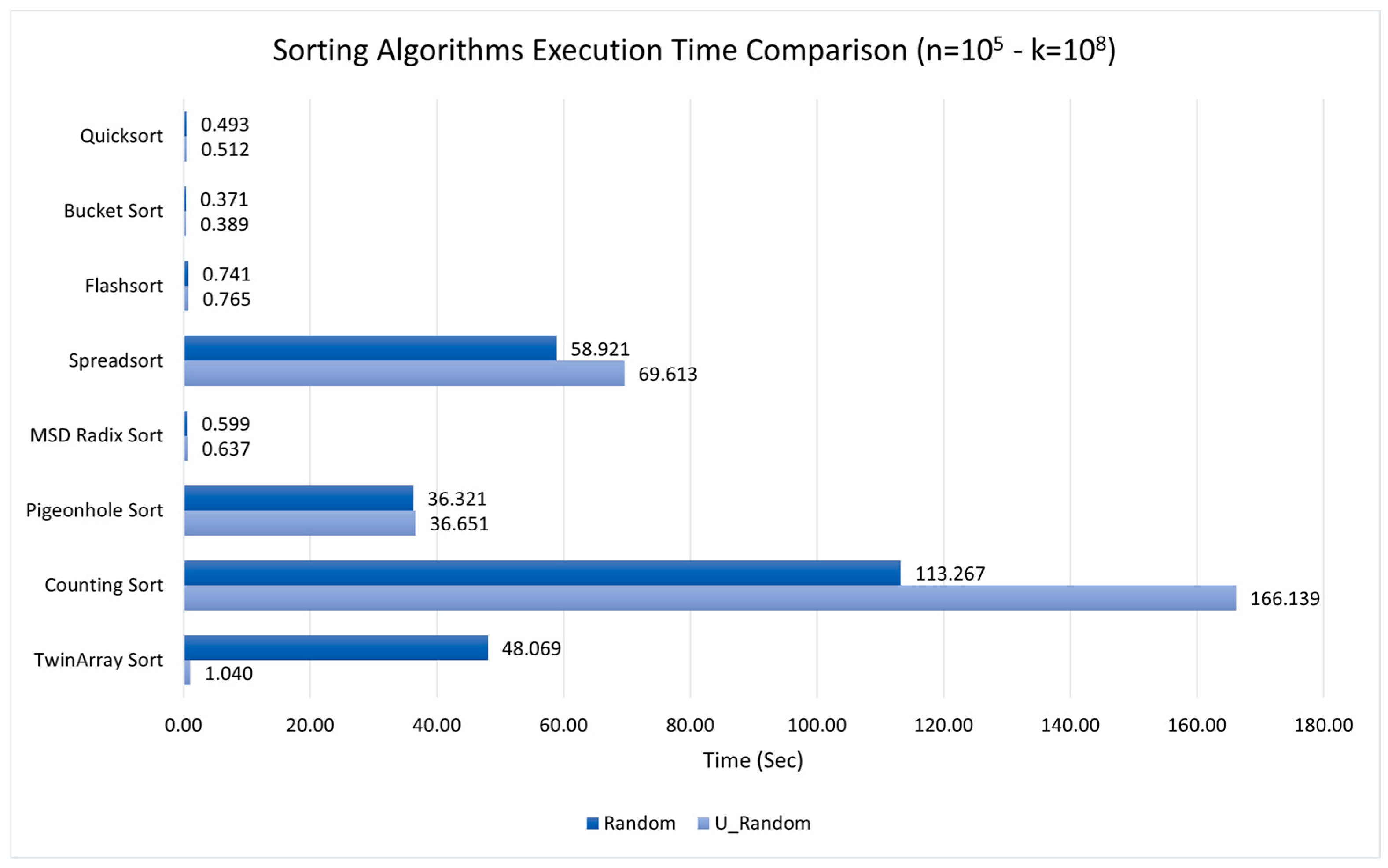 In further comparison, TwinArray Sort performed significantly faster for unique element arrays. This behavior is associated with the simplified reconstruction path enabled by the conditional distinct array verifier, which reduces constant-factor overhead but does not change the algorithm’s asymptotic complexity. For example, TwinArray Sort used 2322.32 MB of RAM to sort a uniquely distributed random (U_Random) array of size 108 in 66.14 s. On the other hand, Counting Sort required much more memory (4577.63 MB) and took 510.64 s for the same distribution and input size.