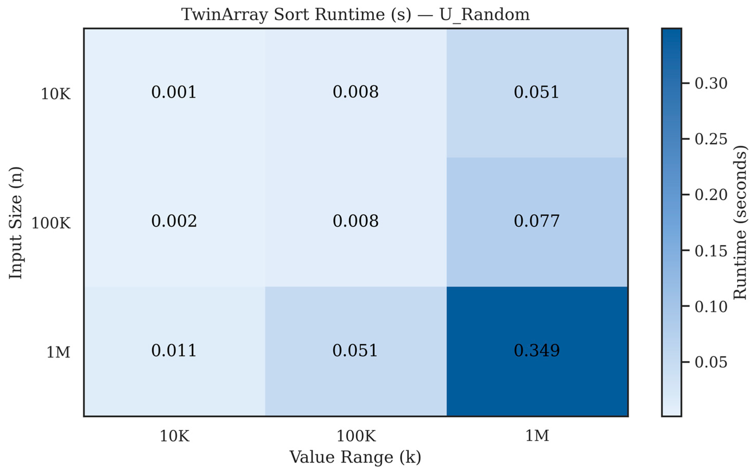 Since the auxiliary arrays scale with k, the efficiency of TwinArray Sort depends on the relationship between n and k. In particular: