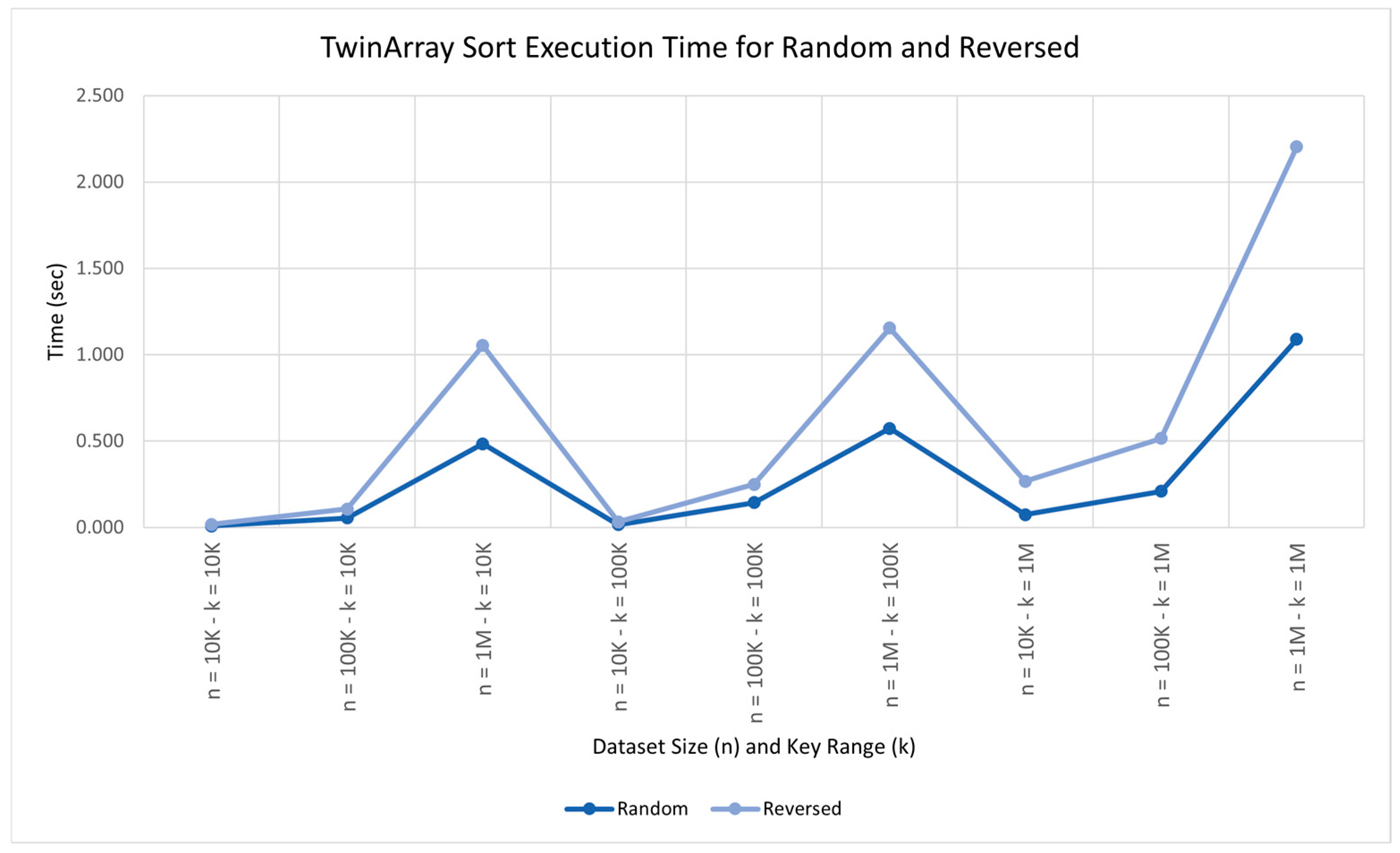 Experimental results show that TwinArray Sort maintains strong performance across a variety of input distributions, including random, reversed, and nearly sorted datasets. Its scalability is evidenced by stable execution times for smaller key ranges and gradual increases when processing larger datasets. TwinArray Sort is best suited for dense-range integer datasets where the key range satisfies k = O(n); performance degradation is expected when the key range grows significantly larger than the input size. In scenarios involving reversed datasets, its performance advantage becomes more pronounced, indicating that the algorithm is capable of detecting and leveraging data patterns to reduce processing overhead. With respect to memory usage, TwinArray Sort occupies a middle ground: it requires more auxiliary space than in-place algorithms such as Quicksort, Flashsort, and MSD Radix Sort, but consumes considerably less memory than Counting Sort and Spreadsort. This positions it as a competitive option in environments where higher auxiliary memory usage is acceptable in exchange for reduced runtime, particularly when compared against other counting-based methods such as Counting Sort and Spreadsort. TwinArray Sort is not an in-place algorithm, and its memory consumption increases linearly with the key range k; however, under identical conditions it consistently requires significantly less memory than Counting Sort and Spreadsort.