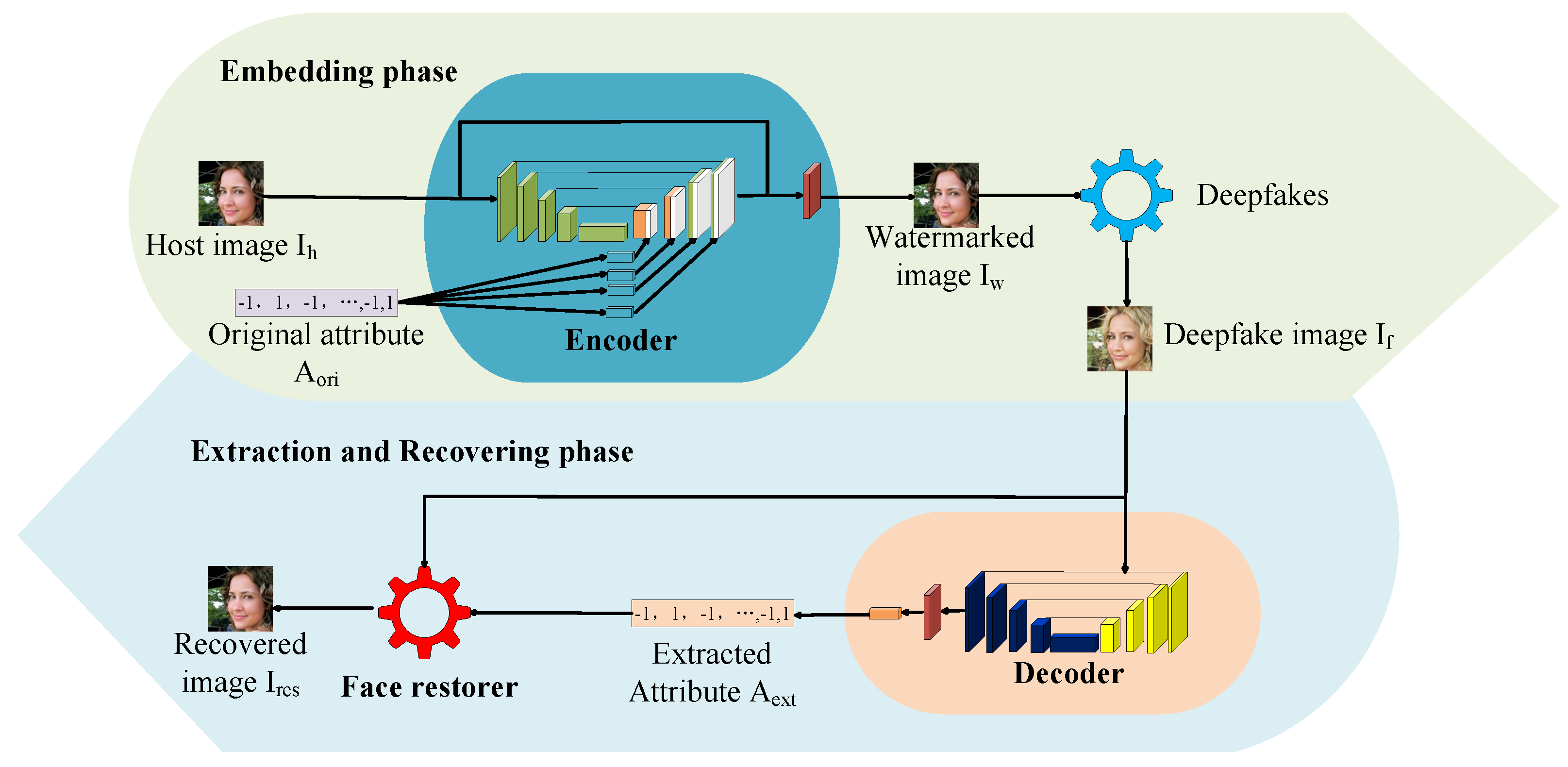 - Zhang, Y.; Ye, D.; Xie, C.; Zhang, Y.; Wang, Y. Dual defense: Adversarial, traceable, and invisible robust watermarking against face swapping. IEEE Trans. Inf. Forensics Secur. 2024, 19, 4628–4641. [Google Scholar] [CrossRef]