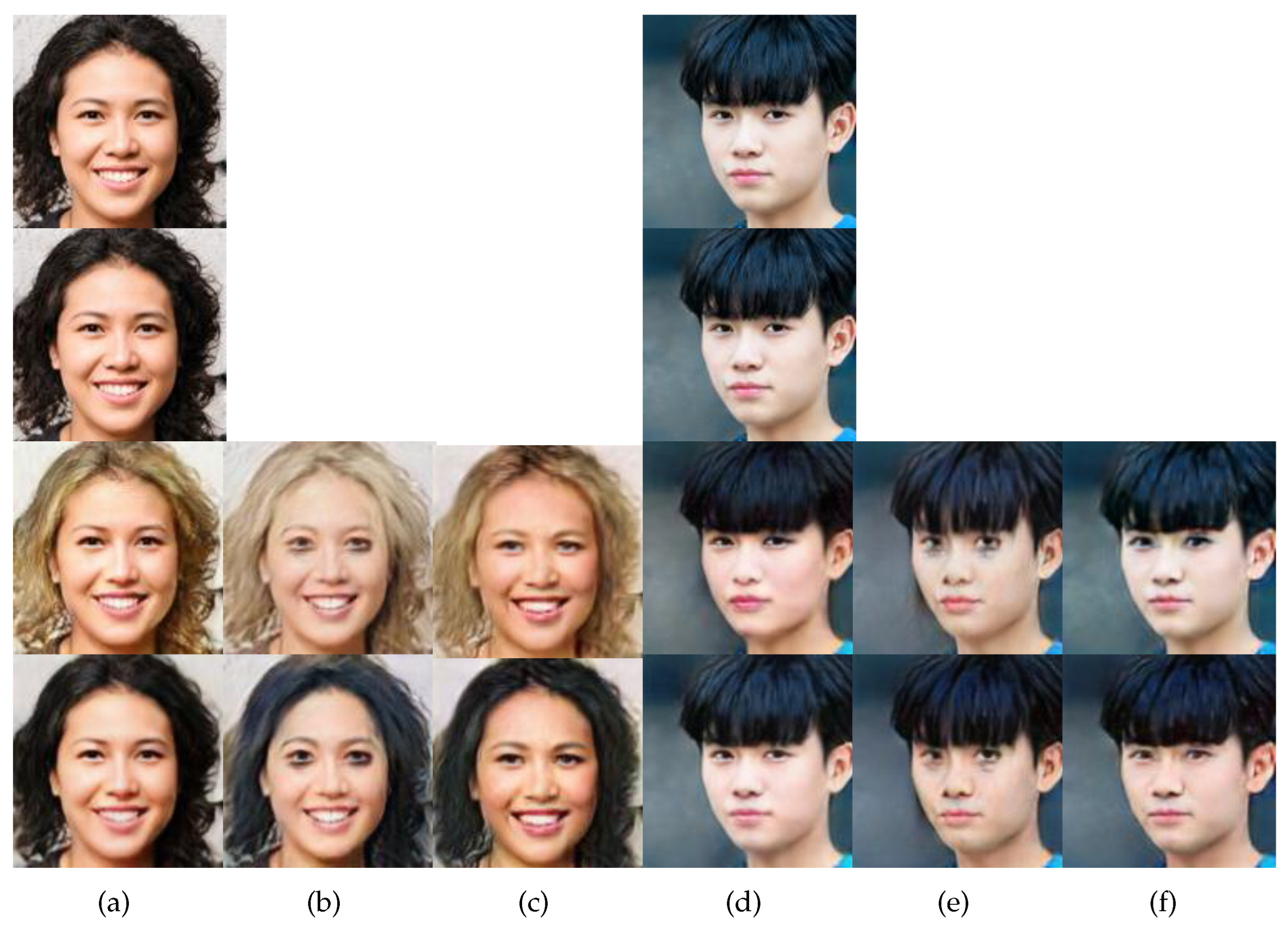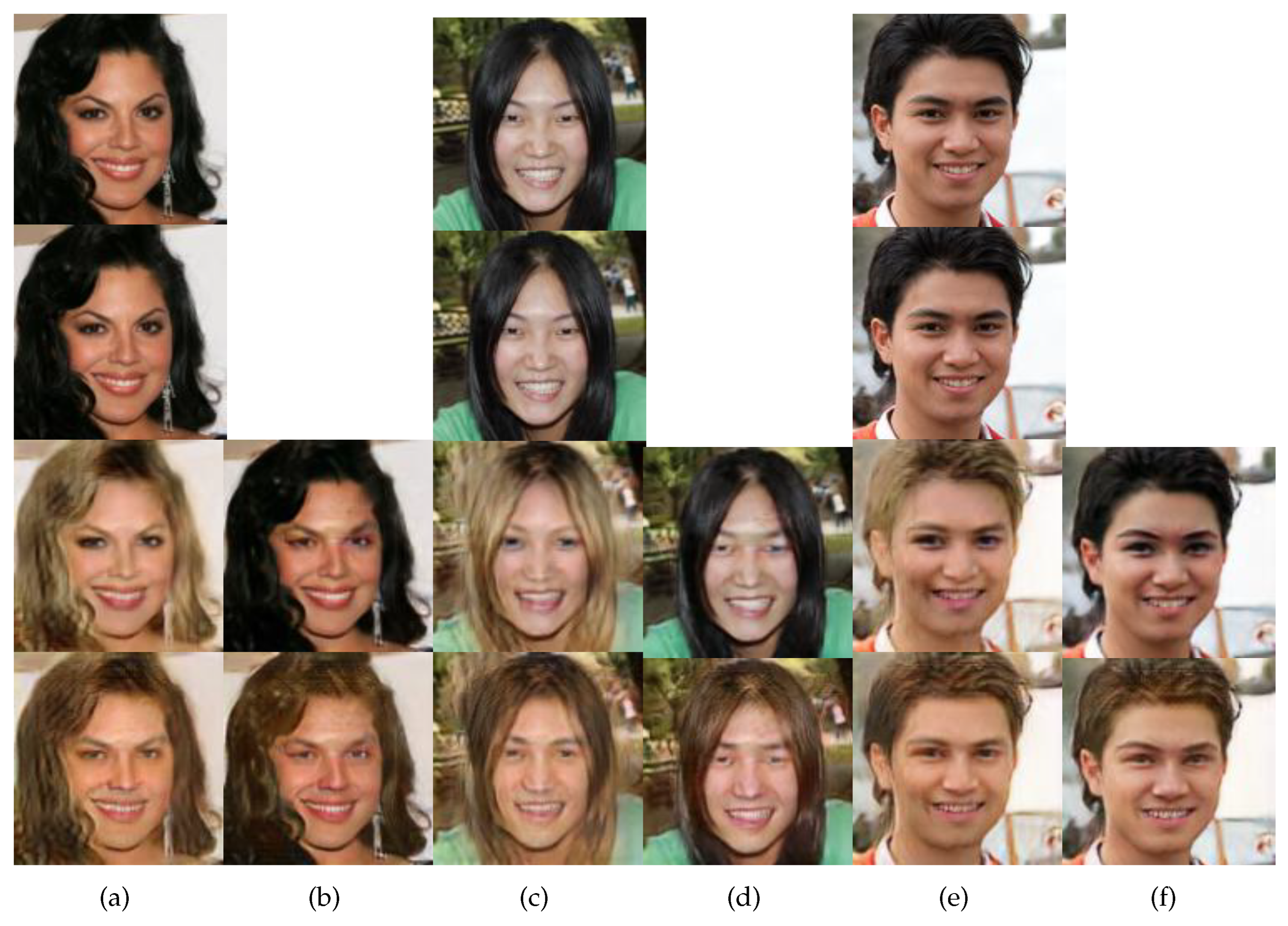 - Kwak, J.; Han, D.-K.; Ko, H. CAFE-GAN: Arbitrary face attribute editing with complementary attention feature. In European Conference on Computer Vision; Springer International Publishing: Cham, Switzerland, 2020; pp. 524–540. [Google Scholar]