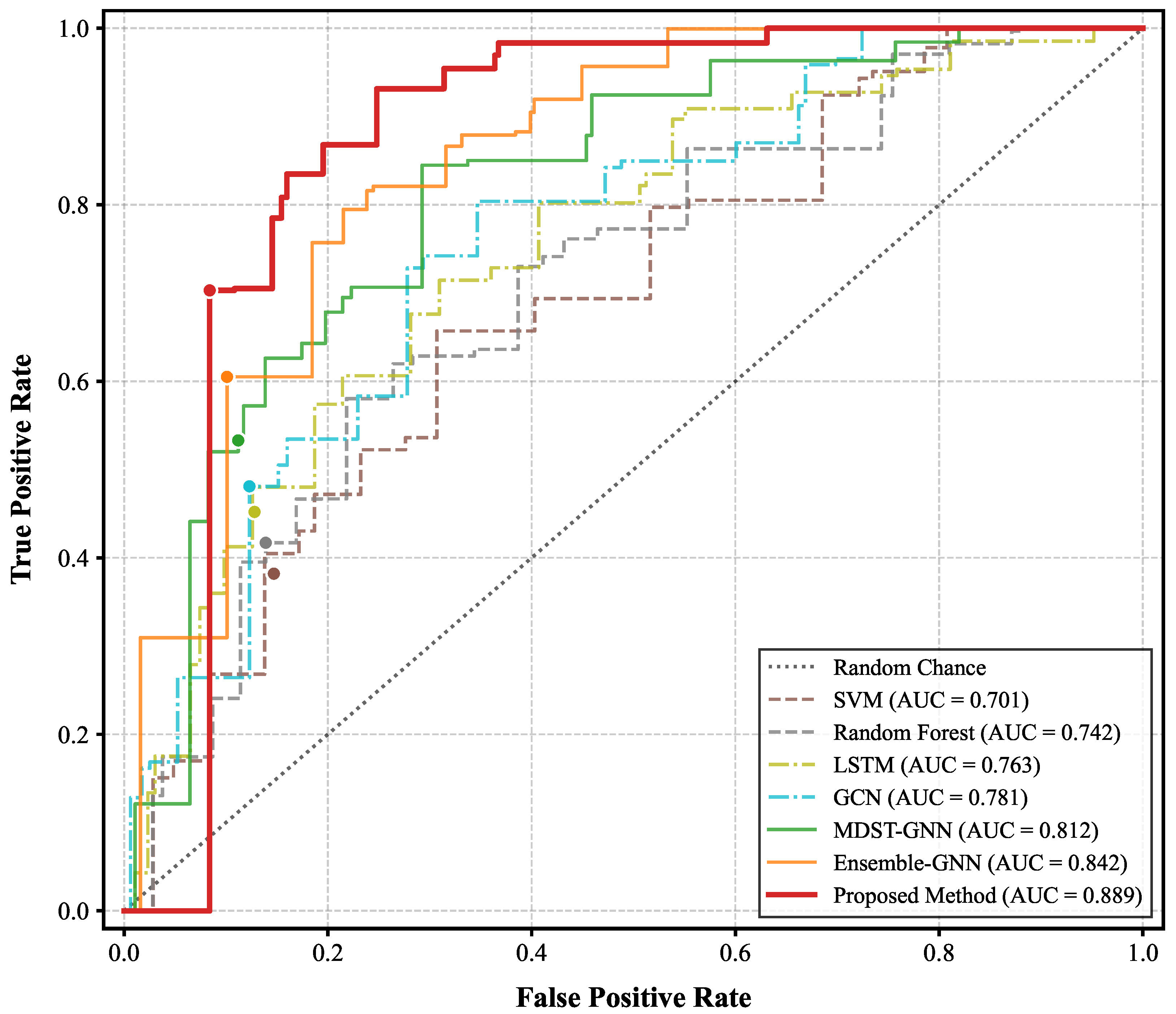 Figure 4. Classical learning models exhibit limited detection capabilities; SVM suffers from low recall due to its inability to capture the nonlinear structure of high-dimensional multimodal features, while Random Forest achieves moderate precision but lacks the capacity to model temporal or structural dependencies, yielding an AUC of only 0.742. However, these lightweight models demonstrate the lowest inference latencies (5.2 ms and 6.1 ms) due to their low computational complexity. Deep models show improved detection performance but at the cost of increased computation time: LSTM benefits from sequence modeling to outperform traditional models in Recall, and GCN effectively captures structural properties, with respective latencies rising to 12.4 ms and 10.7 ms. The multimodal MDST-GNN model achieves an AUC of 0.812 by jointly representing graph structure and market dynamics, which pushes the latency to 15.9 ms. Notably, the state-of-the-art Ensemble-GNN demonstrates strong competitiveness, achieving an F1-score of 0.661 and an AUC of 0.842. This validates the effectiveness of integrating diverse graph architectures (GCN, GAT, GIN) to capture complex topological patterns. However, this performance gain comes with a significant computational penalty; the ensemble voting mechanism across multiple subnetworks results in the highest latency of 22.8 ms, potentially hindering its deployment in high-frequency trading environments. In contrast, our proposed method achieves the highest detection performance with a Recall of 0.703 and an AUC of 0.889. While the dual-branch architecture and adaptive fusion mechanism incur a latency of 19.2 ms, this is significantly more efficient than the heavy Ensemble-GNN baseline. Crucially, this latency remains well within the millisecond-level requirement for real-time financial risk control. The results confirm that our framework strikes the optimal balance between security coverage and response speed, delivering superior accuracy without the prohibitive computational cost of ensemble approaches.