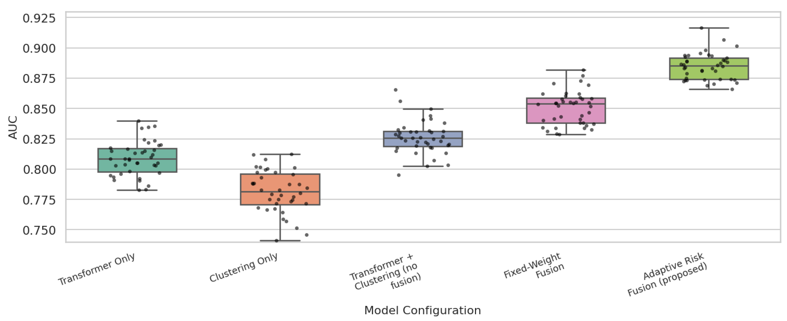 Table 6, the Transformer-only model yields higher AUC and F1-score, but its long-range attention operations introduce substantial latency. The clustering-only branch achieves the lowest latency due to its lightweight distance-based computation, but its inability to capture long-term temporal dependencies results in weaker F1-score. When combining the two branches without fusion, slight performance gains are observed, but the absence of an integration mechanism limits the utilization of complementary information. Fixed-weight fusion further improves performance but lacks adaptability, making it unstable under varying market conditions. The proposed adaptive risk fusion mechanism achieves the best performance across all metrics, reducing FPR while increasing detection accuracy, indicating that dynamically adjusting the importance of each branch produces more reliable anomaly judgments.