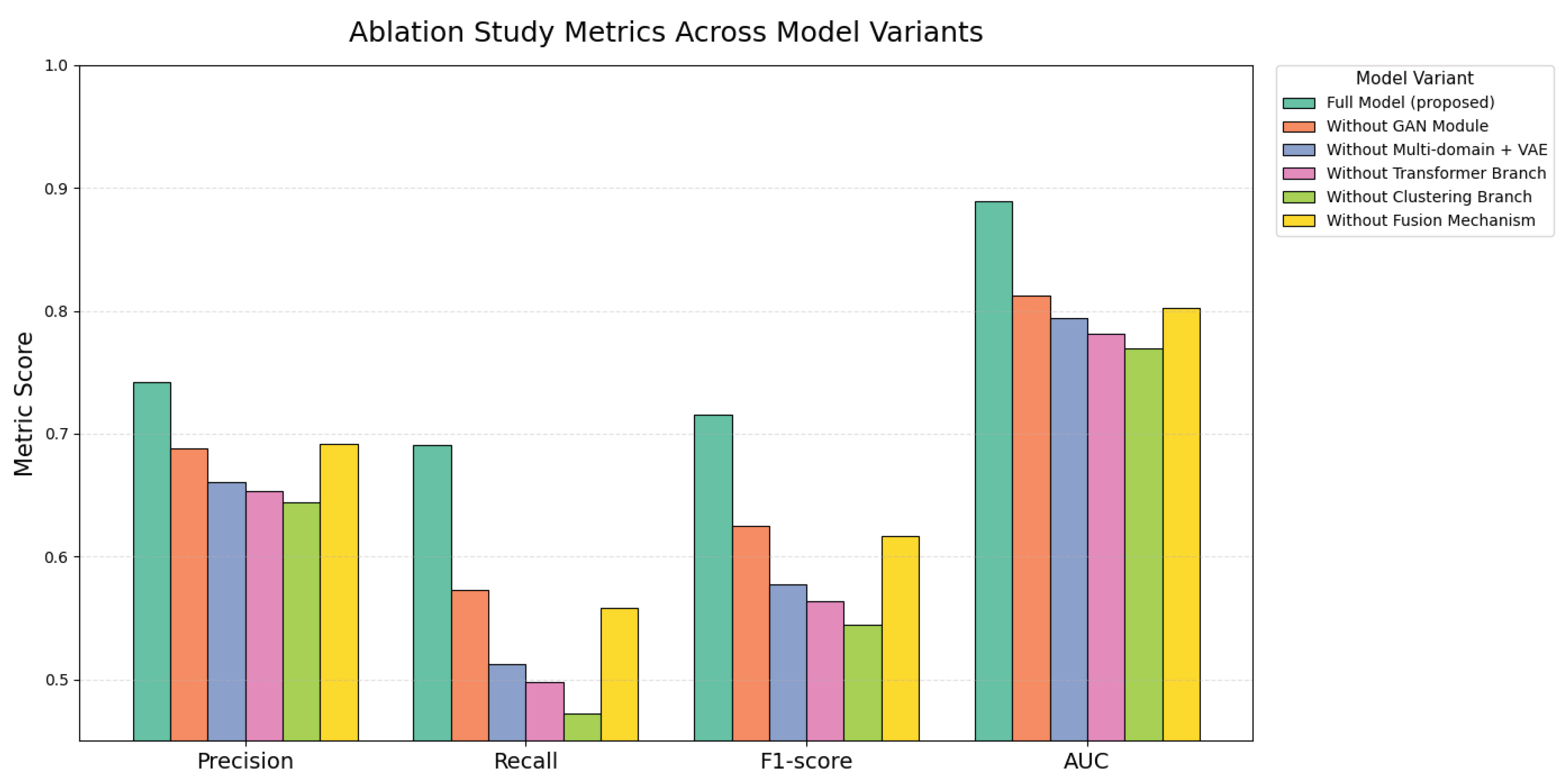 Figure 6. The GAN module expands the minority-class support region by approximating fraudulent marginal distributions, and its removal directly reduces the recall rate due to diminished boundary coverage. The multi-domain + VAE module constructs a smooth, continuous, high-density latent manifold for normal samples, while anomalies occupy low-density regions; removing this module disrupts the density-based discrimination mechanism, making it more difficult to distinguish anomalies. The Transformer branch provides long-horizon temporal modeling, and its removal eliminates sensitivity to gradual deviations or multi-step manipulations. The clustering branch specializes in detecting localized structural outliers, and its removal impairs the detection of abrupt behavioral shifts. The fusion mechanism mathematically enables a nonlinear combination of temporal and structural modalities, allowing dynamic reweighting based on reliability. Its removal breaks this adaptive balance, leading to systematic degradation of detection performance. These results confirm that the superior performance of the complete model arises from the coordinated interaction of multiple components across high-dimensional, multi-domain, and multi-scale representation spaces, and the absence of any single module disrupts this synergy, leading to consistent declines in detection accuracy.