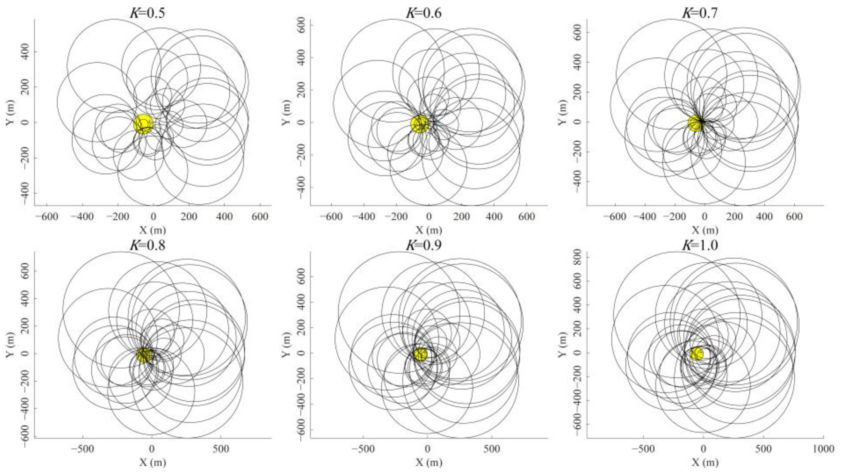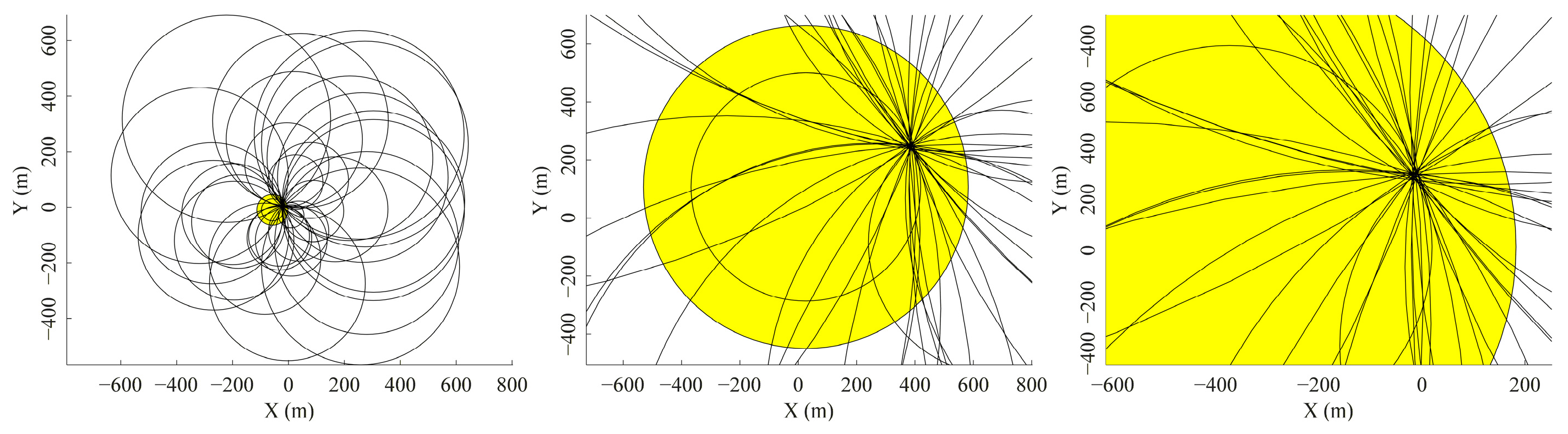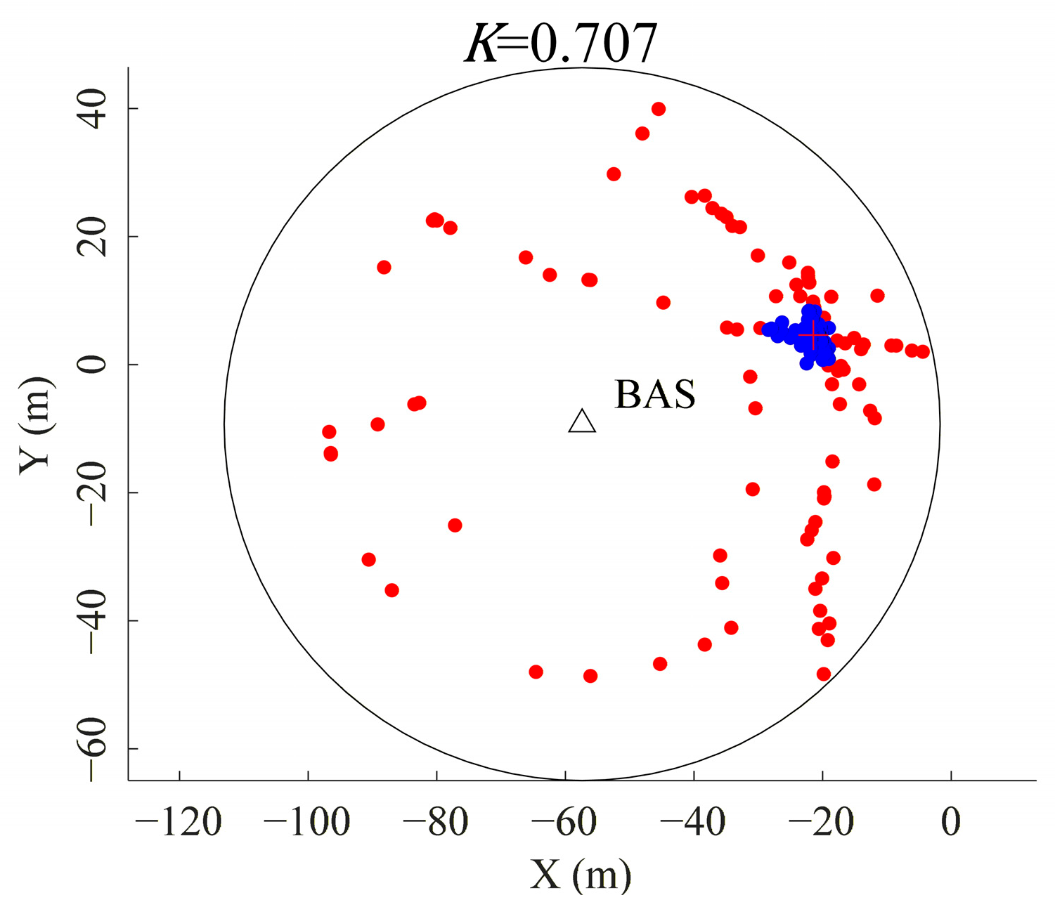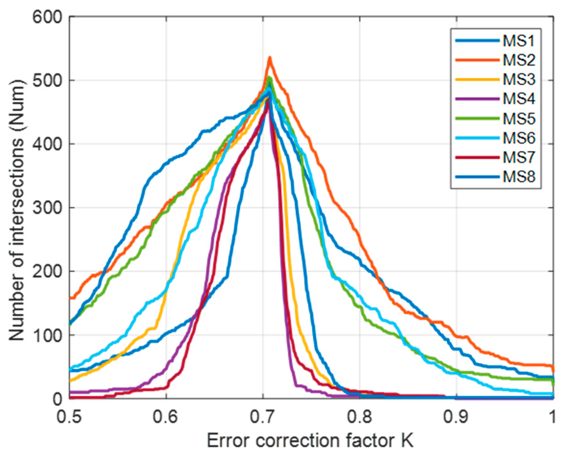 - Calculate the distance from each point in the intersection set to the centroid, eliminate the intersections whose distance is greater than the mean of , and obtain the intersection set .