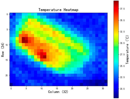 To achieve real-time temperature perception and fault warning, the proposed system employs an industrial-grade infrared thermal imager mounted on a metallic shielding bracket positioned 0.5 to 1 m in front of critical heat-generating areas. This installation effectively minimizes the influence of electromagnetic interference and mechanical vibration. The imager captures temperature data at a frequency of one frame per second, producing raw thermal map matrices of 32 × 24 pixels. These matrices represent the spatial distribution of surface temperatures, overcoming the inherent limitations of traditional point-type thermocouples, which only provide single-point measurements with limited coverage.