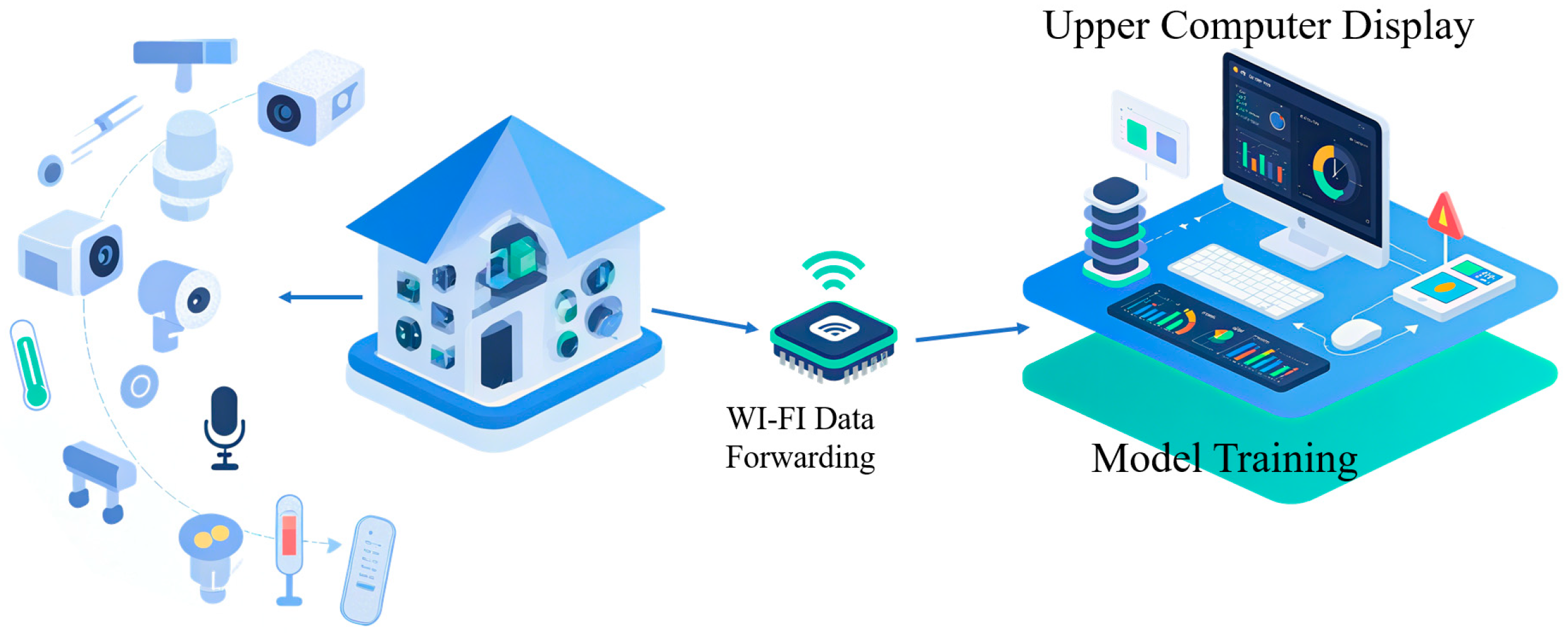 To guarantee the accuracy of data fusion, spatiotemporal calibration among multiple sensors is performed prior to system operation. Each sensing unit is driven by an STM32 microcontroller, which automatically assigns a millisecond-level timestamp to every acquired data frame. All sensor outputs are encapsulated in JSON format and include a unique device ID, three-dimensional coordinates, and the timestamp. The data packets are then transmitted over Wi-Fi or 4G networks to the host computer.