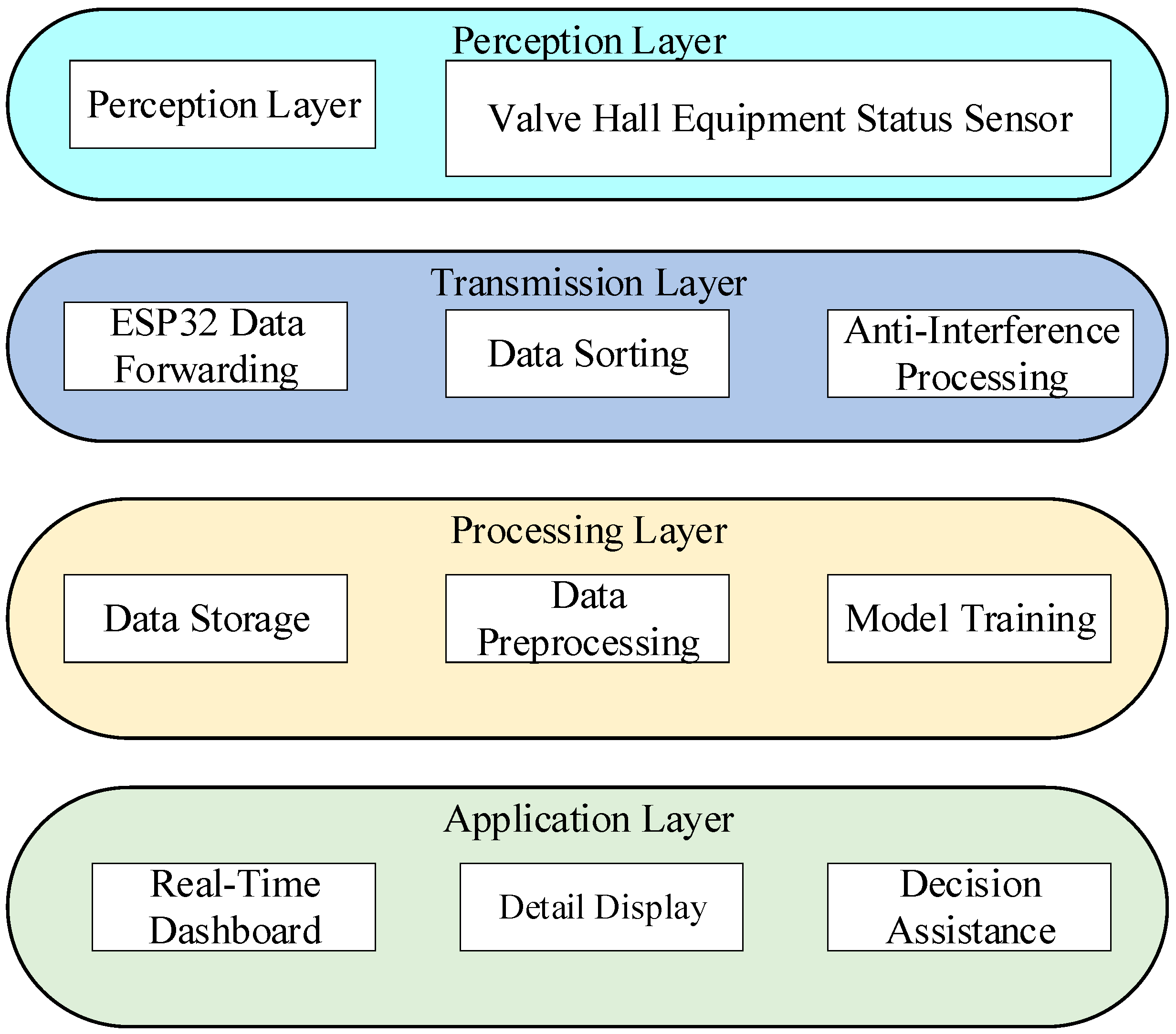 This hierarchical framework seamlessly integrates the entire workflow—from raw-data collection to intelligent model processing and result visualization—forming a closed-loop system compatible with the operation and maintenance requirements of valve hall applications. It fulfills the core research objectives of multi-source fusion, fault diagnosis, and performance evaluation.