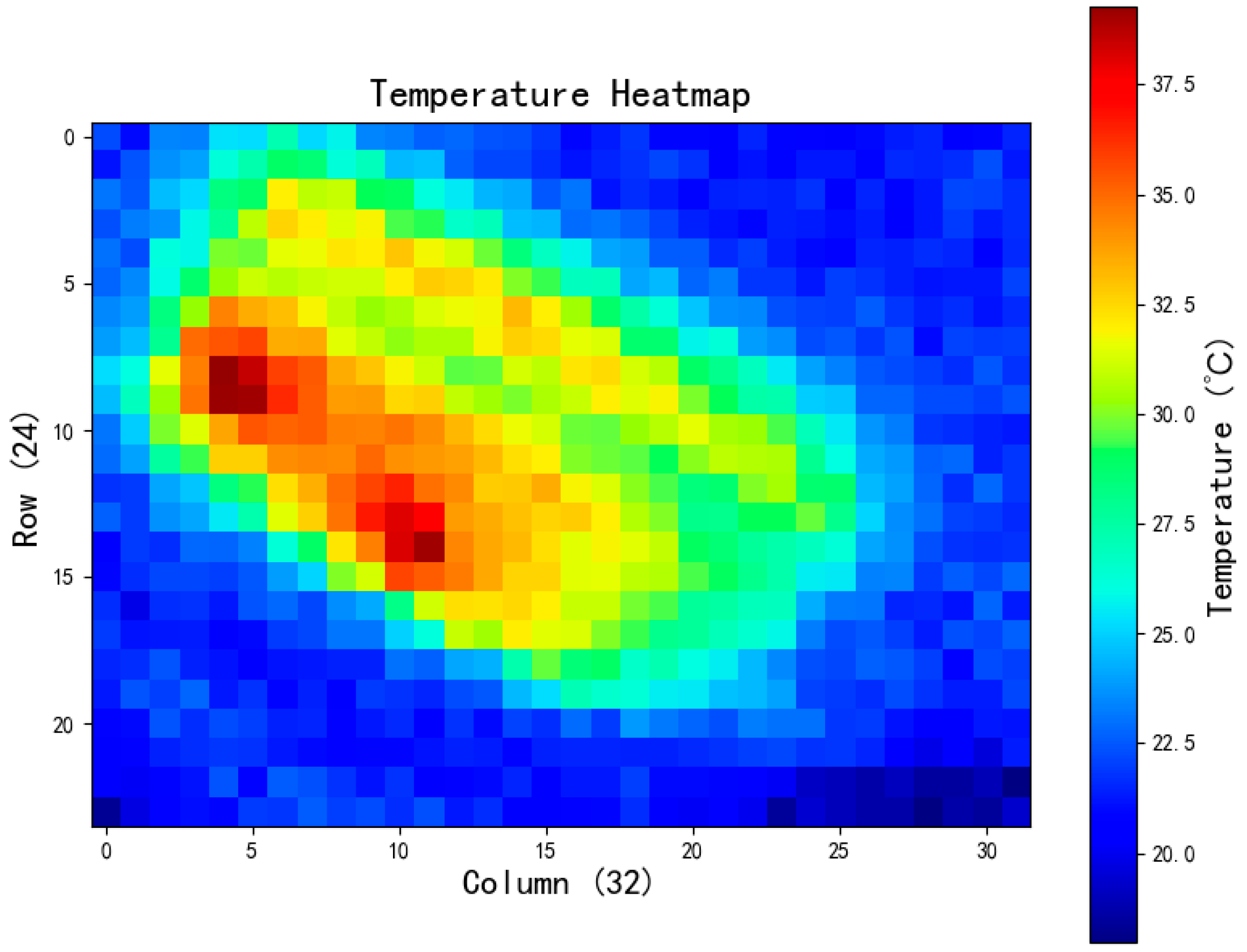 The raw temperature matrix is converted into an intuitive thermal image representation through a pseudo-color mapping algorithm. In this process, areas with temperatures ≤ 28 °C are displayed in blue, representing normal conditions; regions between 28 °C and 35 °C are shown in yellow, indicating areas of concern; and zones exceeding 35 °C are marked in red to denote alarm or warning conditions. This color mapping visualization enables clear identification of temperature gradients and spatial distribution across the monitored equipment surfaces.