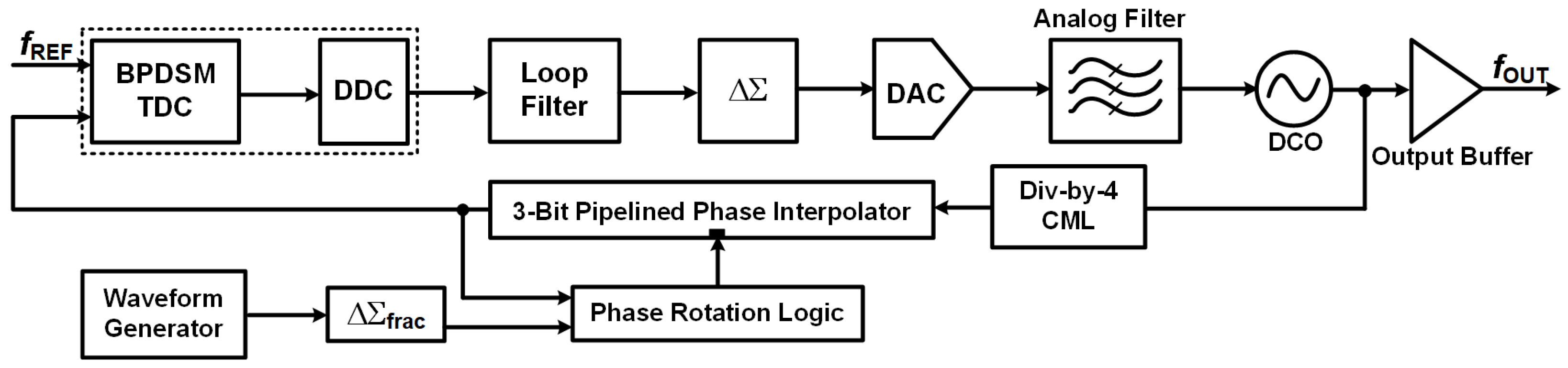 A waveform generator, together with a dedicated delta-sigma modulator, provides control codes for the phase interpolator, enabling accurate frequency modulation and chirp generation. This modulation path operates in parallel with the main PLL loop and does not compromise loop stability.