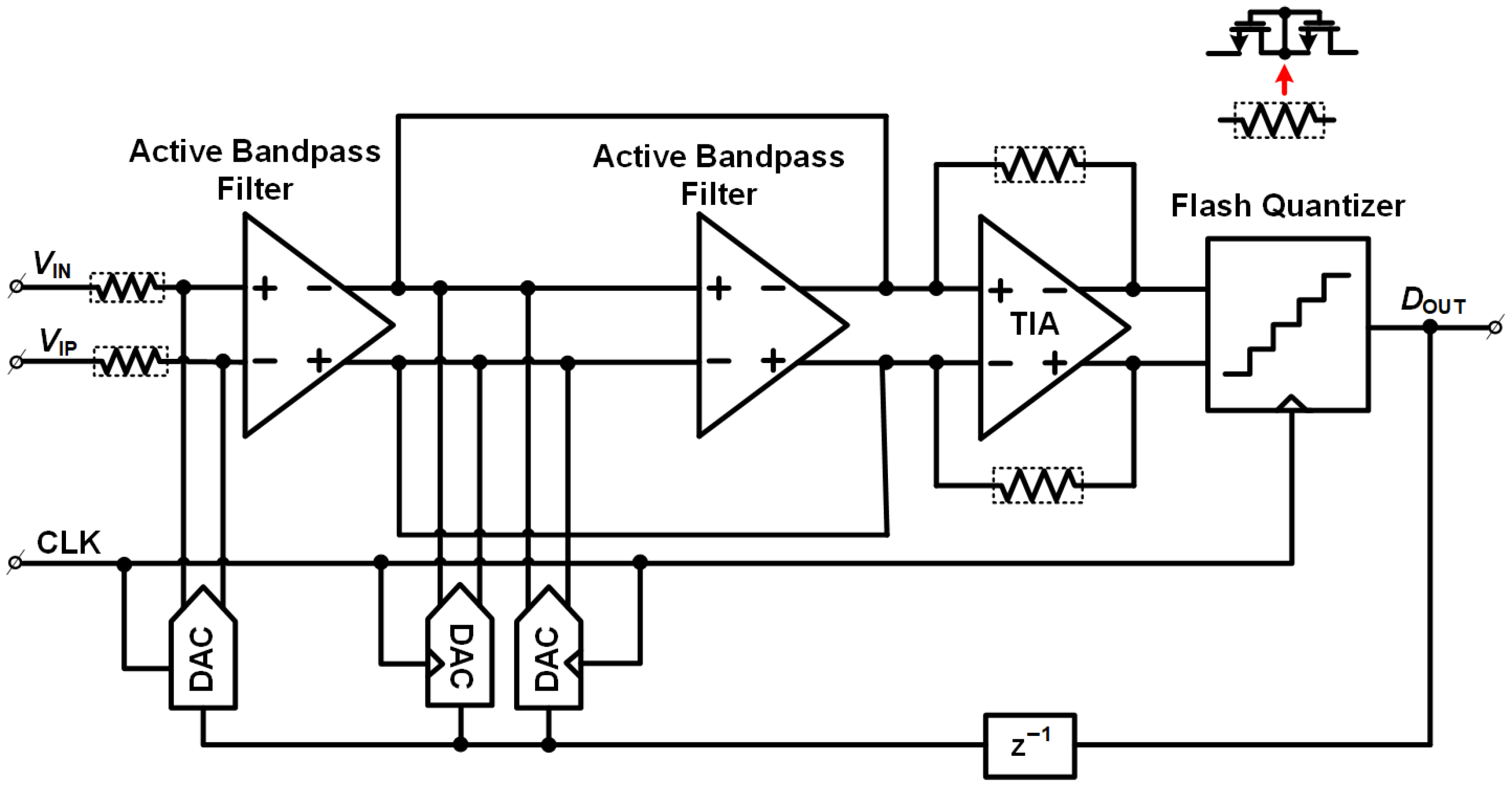 Figure 4b, which converts the filter output current into a voltage signal with sufficient gain to drive the subsequent quantizer. The TIA also provides additional isolation between the loop filter and the quantizer, reducing the direct loading effect of the quantizer input and improving overall loop stability. The feedback resistors around the TIA, as indicated in the figure, define the effective transimpedance gain and contribute to the overall noise transfer function of the delta-sigma loop.