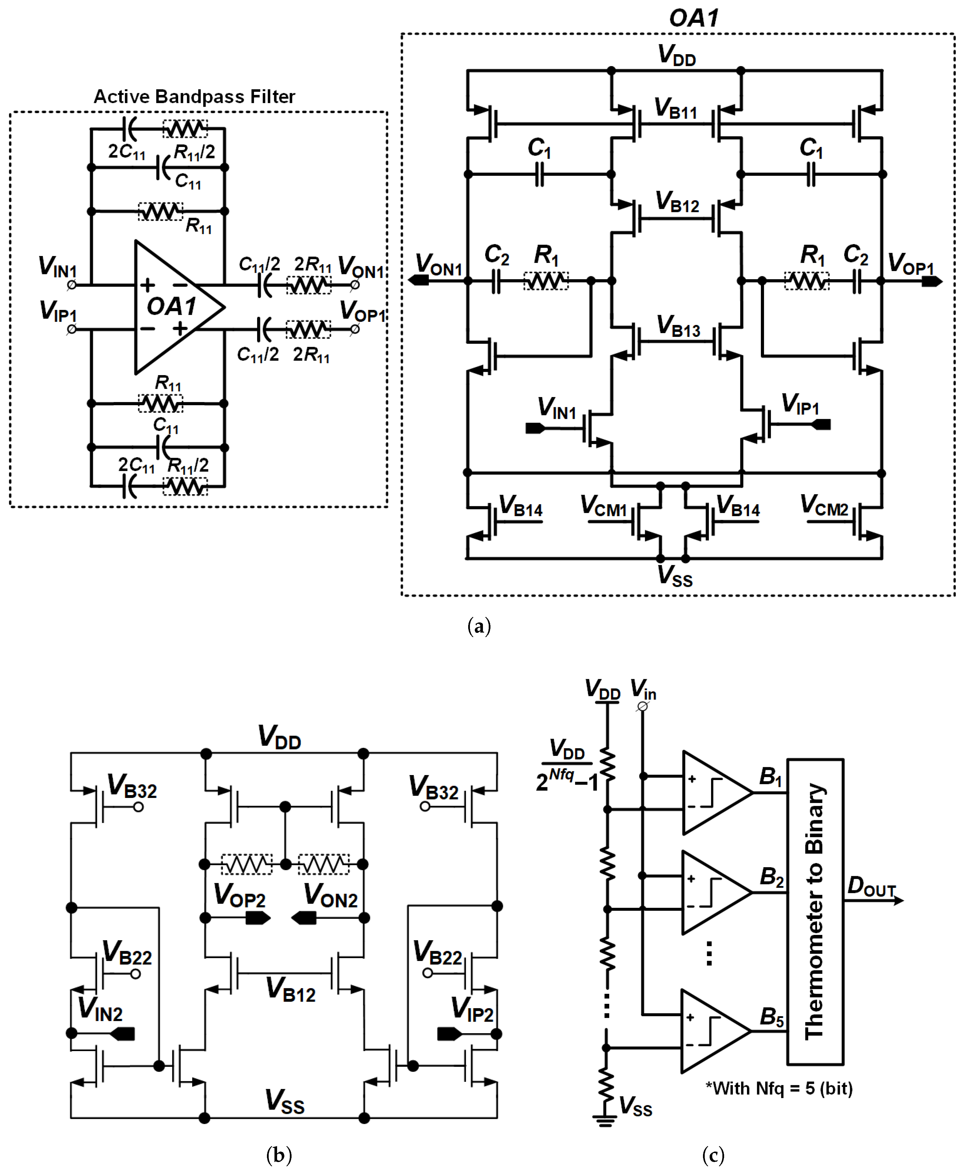 Figure 4a. These signals are first applied to the active band-pass filter implemented using the operational amplifier (OA1) and its surrounding RC network. The band-pass filter is realized by appropriately combining resistive and capacitive feedback paths, as indicated by the components