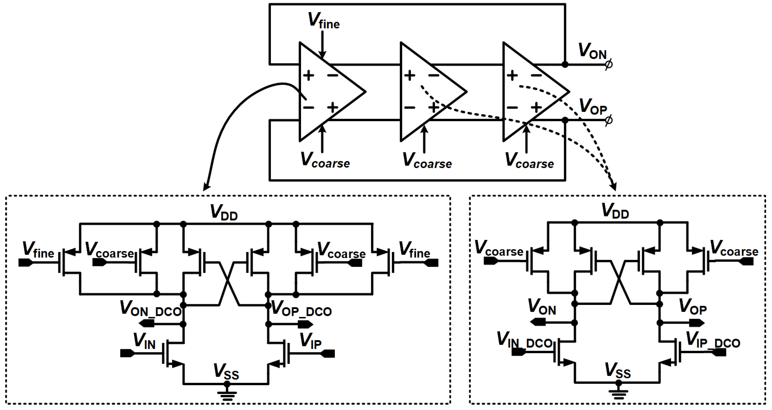 Frequency tuning is realized through two separate control paths, labeled and in the figure. The coarse control voltage adjusts the biasing condition or effective load strength of the delay cells, thereby shifting the overall operating point of the oscillator. This path provides a wide tuning range and is mainly used to compensate for process, voltage, and temperature variations and to place the free-running frequency within the desired operating range of the PLL. Due to its coarse resolution, is primarily employed for frequency centering rather than dynamic loop correction.
