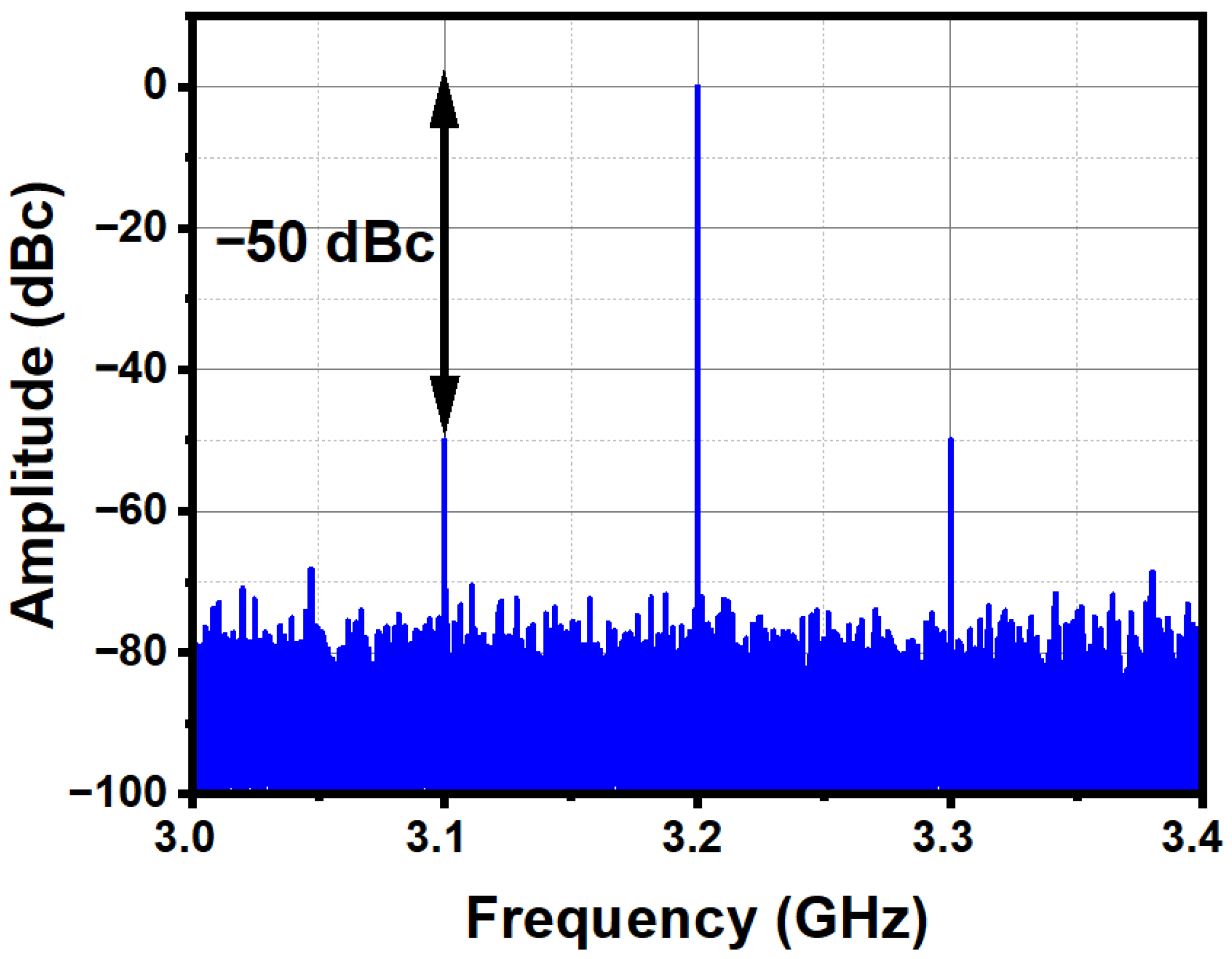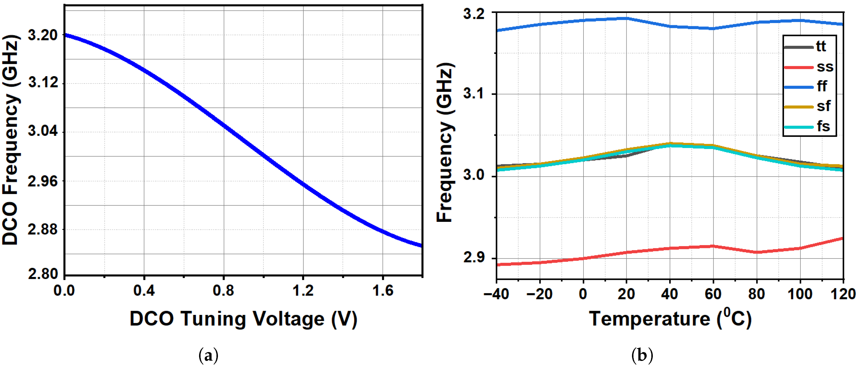 Figure 6a, the DCO exhibits a continuous, monotonic tuning characteristic that covers the targeted near-3-GHz band (2.86–3.2 GHz), providing sufficient margin for frequency centering and closed-loop operation.