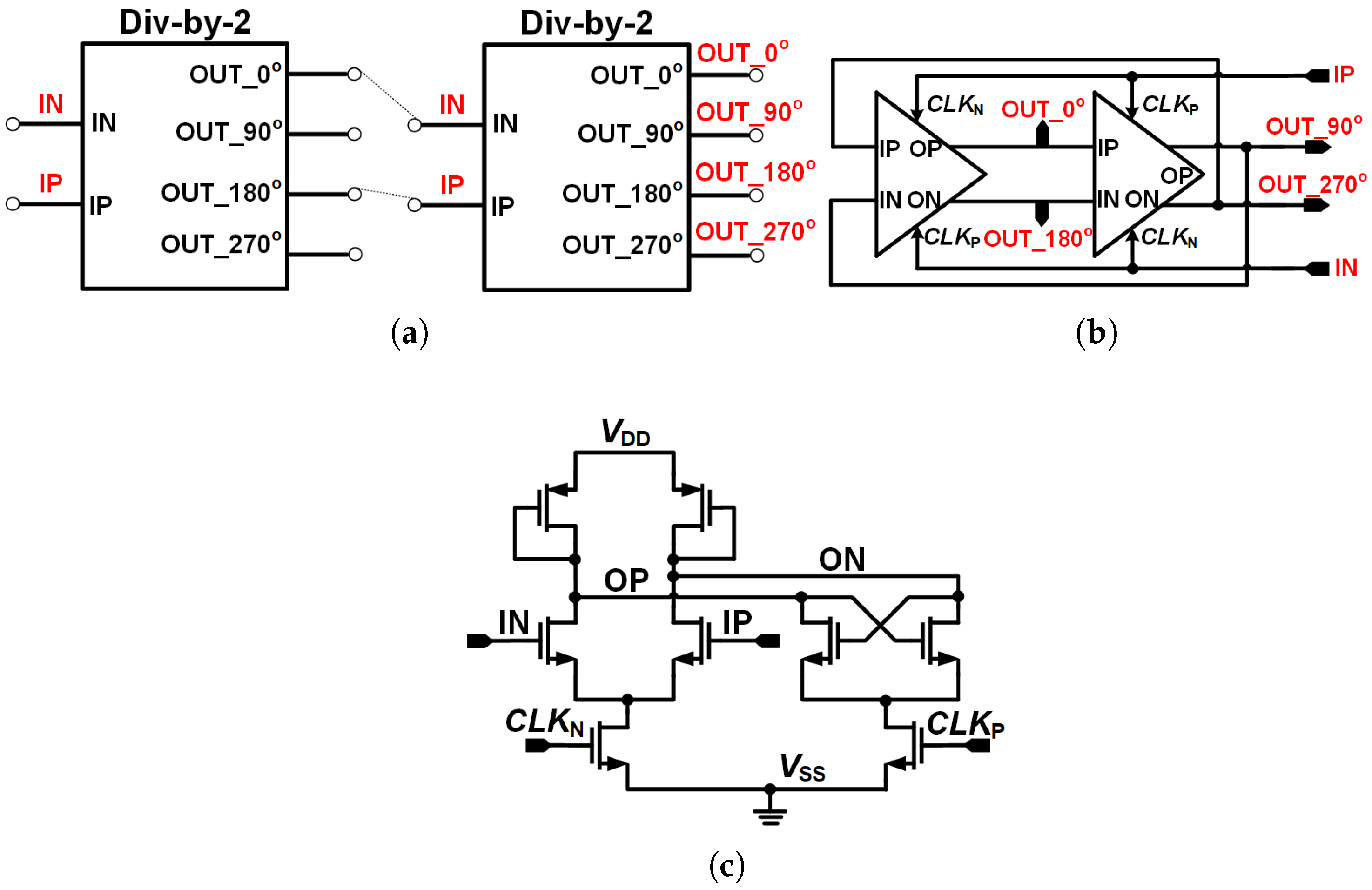 At the transistor level, each CML divide-by-2 stage consists of a differential input pair driven by the input signals (IN and IP), a clock-controlled sampling network governed by the complementary clock signals and , and a cross-coupled load structure that provides positive feedback for bistable latch operation. The constant bias current characteristic of the CML topology minimizes voltage swing and supply current variations during switching, thereby reducing sensitivity to supply noise and lowering output jitter. The differential output nodes, labeled OP and ON, generate complementary clock signals that inherently preserve duty-cycle symmetry and enable accurate phase generation.