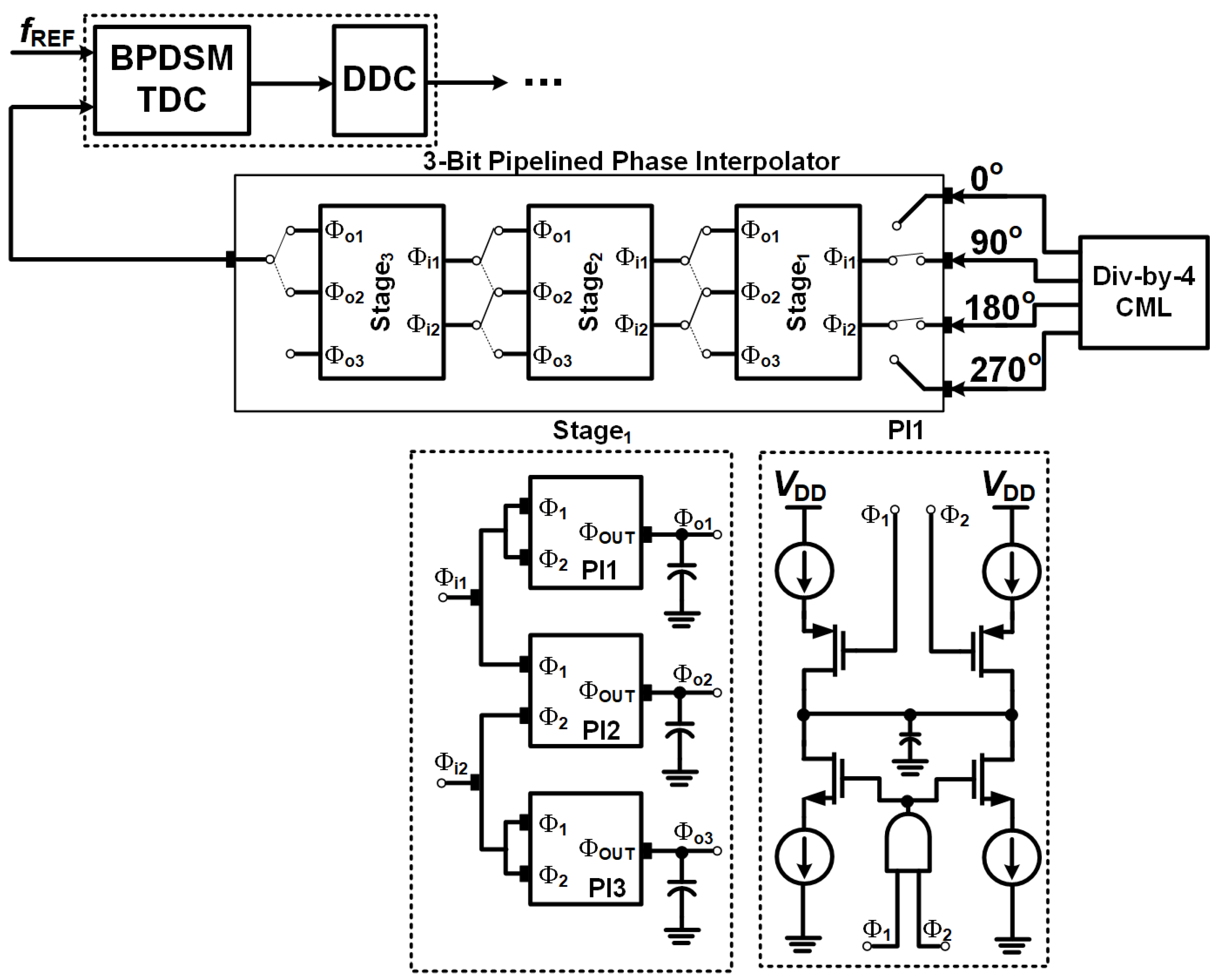 In the feedback path, a CML divide-by-4 divider generates four evenly spaced clock phases at , , , and . These phases are fed into a multi-stage pipelined phase interpolator with 3-bit resolution. The phase interpolator generates intermediate phase steps with fine resolution, enabling fractional-N frequency synthesis without the use of a digital-to-time converter (DTC). By reducing the effective phase step size during fractional operation, the phase interpolator significantly suppresses in-band quantization noise and fractional spurious tones.