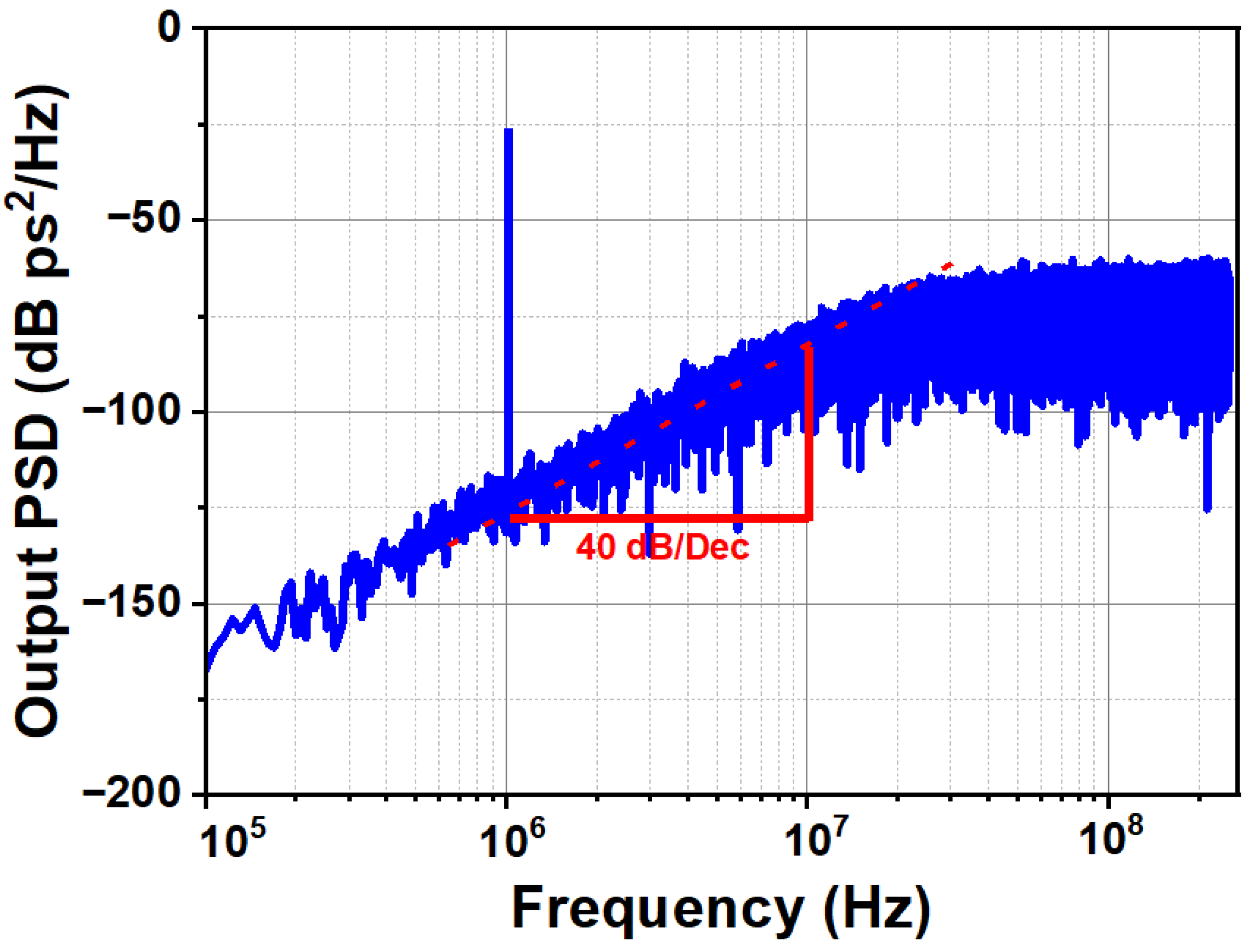 7 Hz, the PSD rises with a slope of about 40 dB/dec, which is characteristic of second-order noise shaping. This indicates that the quantization noise is pushed away from low frequencies where the PLL is most sensitive and is redistributed toward higher offsets, thereby reducing its contribution to in-band phase noise and improving the integrated jitter within the band of interest. The measured SNDR reaches 63 dB over a 5-MHz bandwidth, corresponding to an ENOB of 10.03 bits, as illustrated in