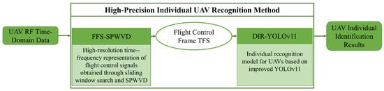 Individual identification based on UAV radio-frequency (RF) signals faces challenges such as co-channel interference, large data volumes, and limited accuracy of classical algorithms. To address these issues, this paper proposes a systematic solution. First, a frame-based smoothing pseudo-Wigner–Ville distribution (FFS-SPWVD) method is employed to generate high-resolution time–frequency maps of UAV flight control signals, and an individual UAV identification image dataset is constructed using the DroneRFb-DIR dataset. Second, an MA-MFFAN module is designed to fuse multi-scale features, mitigating information loss caused by downsampling. Finally, the PSFSC module is introduced to focus on target regions while reducing computational complexity, forming the final model, DIR-YOLOv11. Experimental results show that the proposed method can independently extract flight control signal frames while preserving high-resolution time–frequency characteristics. In individual recognition tasks, it achieves an accuracy of 0.9617, an mAP50 of 0.9782, and a recall of 0.9529. These results indicate that the model precisely captures key signal features and maintains a low misrecognition rate, even in complex signal environments. Overall analysis shows that the proposed method outperforms other advanced algorithms by achieving a better balance between recognition accuracy and resource consumption.