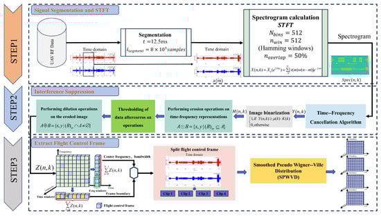 This section introduces the FFS-SPWVD preprocessing method, with its algorithmic flow illustrated in Figure 3. First, a low-resolution time–frequency analysis is performed on the radio signal. Then, using a coarse search, the flight control signal is extracted in the time domain based on the search results and subjected to high-resolution time–frequency analysis. The algorithm enables precise localization of flight control frames while providing high-resolution time–frequency representations.