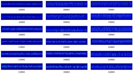 The raw signals from the DroneRFb-DIR dataset were processed using the preprocessing algorithm proposed in this study, resulting in 10,300 time–frequency plots of flight control signals across six UAV categories. These plots formed an image dataset for individual UAV recognition. All images were manually annotated using semi-automated tools and randomly divided into training, testing, and validation sets in a 7:2:1 ratio. Each UAV type includes three distinct individuals. The models DJI Mavic 3 Pro, DJI Mini 2 SE, DJI Mini 4 Pro, DJI Mini 3, DJI Air 3, and DJI Air 2S are labeled A, C, D, E, F, and G, respectively. For instance, the three DJI Mavic 3 Pro individuals are numbered A0001, A0002, and A0003. In total, the dataset contains 18 unique labels, as summarized in Figure 10.