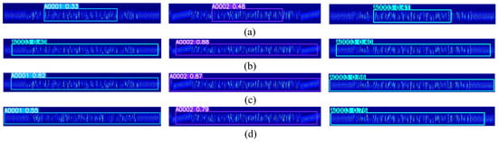To visually illustrate the individual recognition performance of the proposed algorithms, Figure 12 presents partial time–frequency signal recognition results for UAVs using YOLOv11n, YOLOv13, RT-DETR, and DIR-YOLOv11. The images are derived from the preprocessing subsystem output, showing DJI Mavic 3 Pro Individuals 1, 2, and 3 from left to right. Figure 12a shows the recognition results of YOLOv11n on the test image, Figure 12b shows YOLOv13’s results, Figure 12c shows RT-DETR’s results, and Figure 12d shows DIR-YOLOv11’s results. It is evident that the baseline model YOLOv11n focuses only on partial regions when processing complex flight control signal frames, omitting the preamble and postamble codes. This leads to incomplete feature extraction, as reflected in the selected regions and confidence scores. Compared to the baseline, YOLOv13 covers the entire flight control signal frame but still struggles to distinguish individual differences, mistakenly identifying Individual A0001 as A0003. The state-of-the-art RT-DETR model, leveraging its large parameter count and computational capacity, achieves the best performance in both recognition accuracy and individual discrimination. The proposed DIR-YOLOv11 model achieves maximal coverage of flight control signal frames, with confidence scores for each individual increasing by 0.22, 0.31, and 0.35 compared to the baseline. These results demonstrate that DIR-YOLOv11 effectively performs both signal detection and individual recognition tasks, outperforming other models.