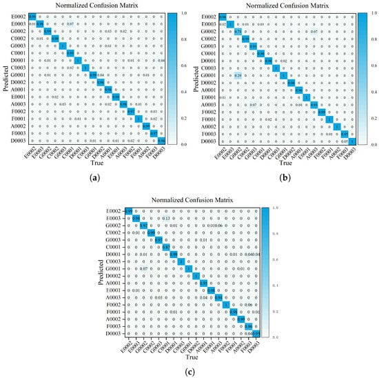 Figure 13 presents the confusion matrices for the three models used in individual UAV recognition when evaluated on the same dataset. Compared to the other two advanced models, this model demonstrates superior performance in distinguishing most UAV types and achieves results closest to those of the state-of-the-art RT-DETR model. However, the confusion matrix indicates that the model still makes misclassifications in certain individual cases. Detailed analysis shows that the confusion between C0001 (DJI Mini 2 SE) and E0003 (DJI Mini 3) mainly arises from their similar model identifiers, identical communication protocols, and narrow flight control signal bandwidths. These factors lead to highly similar time–frequency domain contour features, making it difficult for the model to distinguish between these closely related targets. In addition, slight confusion was observed between the DJI Air 3 models F0003 and F0002. Further examination of their flight control signal frame structures revealed a high degree of similarity in their preamble and postamble codes, which is the primary reason the model struggled to effectively differentiate between them.