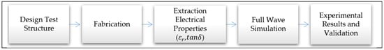 In this part of the article, the design of the test structure and fabrication methods are explained in detail. Also, the design and validation flow chart is illustrated in Figure 2. The process begins with the design of the test structures. This is followed by fabricating the structures and extracting the material’s electrical properties. Finally, full-wave electromagnetic simulations are performed. The results are confirmed by comparing them with experimental measurements.