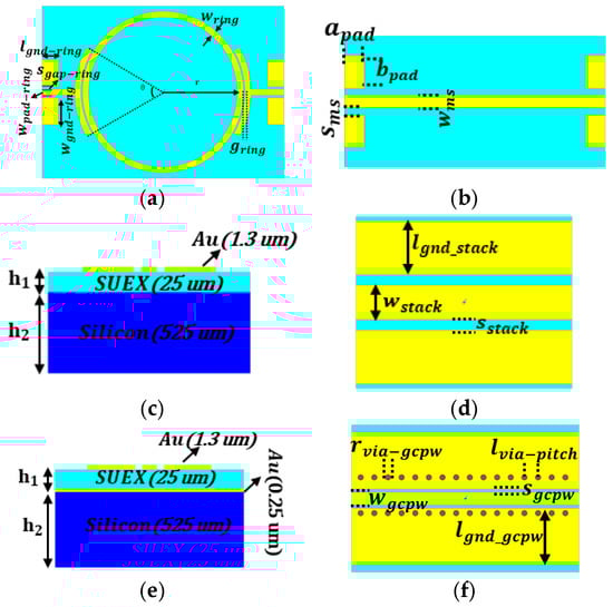 where , , , and denote resonance frequency, speed of light in vacuum, mean ring radius, and effective permittivity, respectively. In order to obtain the dielectric constant of SUEX (), MRRs with different radii with resonances of 10, 20, and 27 GHz are designed, as shown Figure 3a. Both ends of MRRs begin with grounded coplanar waveguide (GCPW) probe pads and then turn into a microstrip line. In addition, 60° circles are inserted at the end of the microstrip line to obtain better coupling efficiency. Additionally, 25 μm diameter microvias are inserted to enhance coupling from the ground pads to the ground plane. The dimensions of the MRRs are given in Table 3.