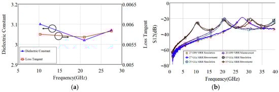 where is the SUEX dry film thickness, is the microstrip line thickness, is the microstrip line width, and is the SUEX dry film dielectric constant. The extracted dielectric constant within the 10.28–27.47 GHz frequency range varied between 3.14 and 3.19. In addition to the quasi-static model, the trial-and-error method is used to extract both the dielectric constant and the loss tangent. In this approach, the dielectric constant and loss tangent are iteratively tuned in the simulation until the simulated resonant frequency and insertion loss closely match the measured values. Depending on the method, the extracted dielectric constant of the SUEX dry film ranged from 2.89 to 3.02 across 10.28–27.47 GHz, which is approximately 7–8% lower than the values obtained by the quasi-static model. The observed discrepancy can be attributed to several factors, including the quality factor (Q-factor) of the ring resonator, minor calibration uncertainties, and deviations in the mean resonator radius. The modeling results indicate that a 50 µm variation in the mean radius of the microstrip ring resonator corresponds to an approximately 1.5–2% change in the extracted dielectric constant. Moreover, the quasi-static model neglects dispersion effects, which may further contribute to the observed deviation [17]. Furthermore, a previous study [18] reported that using different extraction methods to determine the material’s electrical properties can lead to variations exceeding 8%. Overall, variation between the given methods is considered negligible for practical dielectric characterization and remains within acceptable experimental uncertainty limits.